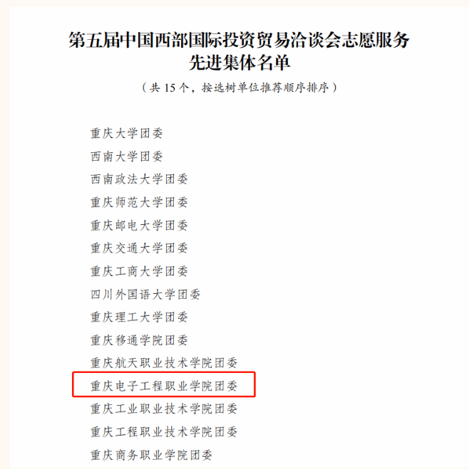 近日,学校团委荣获第五届中国西部国际投资贸易洽谈会志愿服务先进集体,pg国际8名同学荣获第五届中国西部国际投资贸易洽谈会志愿服务先进个人(付世龙:重庆电子工程职业学院2022级电子与物联网学院智能互联网络技术专业学生;刘坤:重庆电子工程职业学院通信工程学院2021级通信软件技术专业学生;刘蕊函:重庆电子工程职业学院电子与物联网学院2021级微电子技术专业学生;余欣然(女):重庆电子工程职业学院数字媒体学院2021级数字媒体技术专业学生;张正阳:重庆电子工程职业学院通信工程学院2022级通信工程专业学生;张馨悦(女):重庆电子工程职业学院数字媒体学院2021级广播影视节目制作专业学生;周俊妍(女):重庆电子工程职业学院智慧健康学院2022级旅游管理专业学生;廖照民:重庆电子工程职业学院电子与物联网学院2021级物联网应用技术专业学生)。