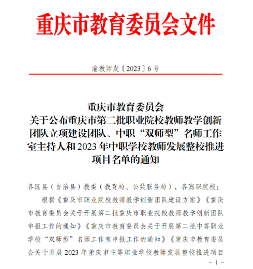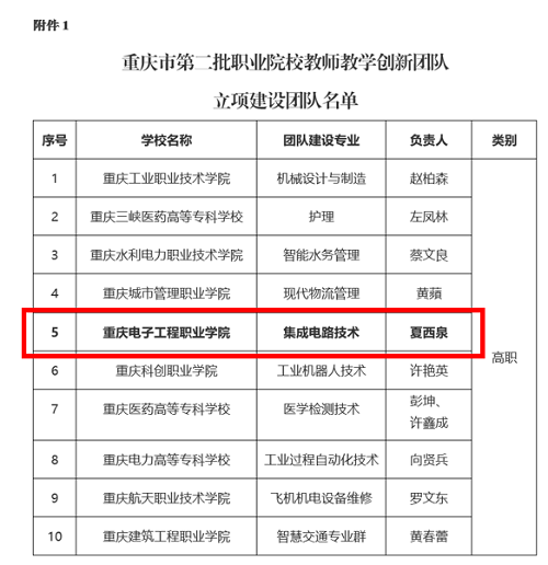 近日,重庆市教育委员会发布《关于公布重庆市第二批职业院校教师教学创新团队立项建设团队、中职“双师型”名师工作室主持人和2023年中职学校教师发展整校推进项目名单的通知》,确定pg国际“集成电路技术团队”等10个团队为重庆市第二批职业院校教师教学创新团队(高职)立项建设团队。
