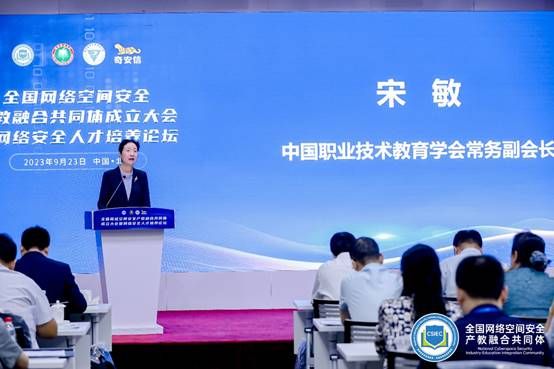 中国职业技术教育学会常务副会长宋敏代表职教学会对共同体的成立表示祝贺,并希望以共同体建设为抓手,探索建立产教融合、科教融汇的新路径,构建“三链融合”的职业教育新生态,将共同体建设与网络安全专委会建设一体推进,推动行业和职业教育数字化转型,共同打造职业教育的国际化平台。