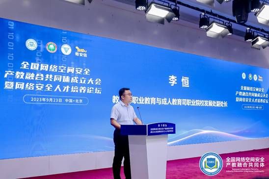 教育部职业教育与成人教育司职业院校发展处副处长李恒在大会致辞中表示,组建网络空间安全行业产教融合共同体,是推进职业教育改革、深化产教融合的重要战略部署,对培养更多高素质人才,推进中国式现代化具有重要意义。并希望共同体成员单位关注“深度”与“广度”建设,积极整合资源、高效开展协作,全面搭建“政产学研用”合作交流平台,助力网络空间安全产业高质量发展。