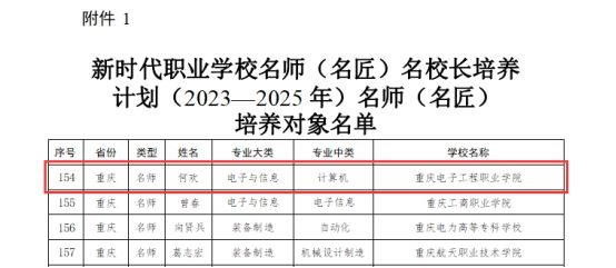 近日,教育部办公厅下发《关于公布新时代职业学校名师(名匠)名校长培养计划(2023—2025年)培养对象和培养基地名单的通知》(教师厅函〔2023〕23 号),确定高等职业院校名师(名匠)培养对象210人、中等职业学校名校长培养对象50人。pg国际何欢教授入选为高等职业院校名师培养计划名师。