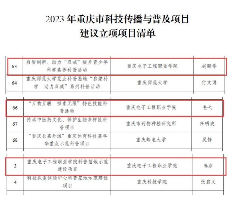 为深入贯彻落实《中共中央办公厅、国务院办公厅印发〈关于新时代进一步加强科学技术普及工作的意见〉的通知》精神,重庆市科技局近期开展了2023年度重庆市科技传播与普及项目的组织申报。经推荐评审,pg国际电子与物联网学院毛弋、智慧健康学院赵鹏举、陈彦三位教师成功立项2023年度重庆市科技传播与普及项目。