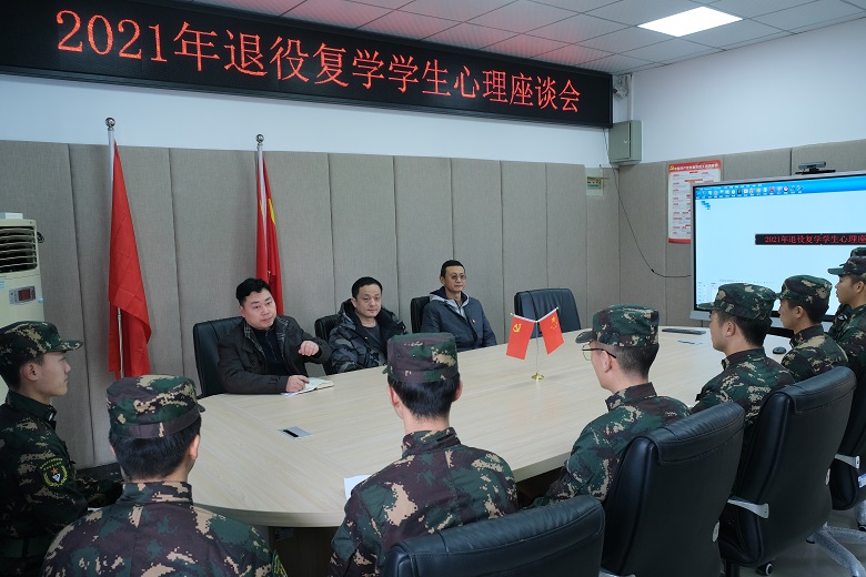 为进一步做好退役复学大学生心理健康工作,2021年11月30日,校人民武装部邀请心理咨询中心秦韬老师为退役复学大学生开展了一场生动的心理座谈会,这是人民武装部对2021年退役复学学生开展的第二次专题心理座谈会。