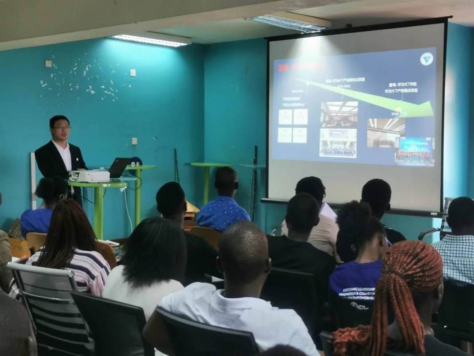 华为技术有限公司乌干达代表处人才生态经理杨程代表华为进行了发言,介绍了乌干达华为ICT学院的建设发展情况,重点对华为ICT大赛、华为认证考试等方面对学校教师和学生的支持政策进行了解读,鼓励学生们积极参与华为ICT大赛和华为认证,并表示未来将依托重电与麦克雷雷大学联合建设的中非(乌干达)ICT学院合作项目,在人才培养、学生认证、华为大赛、人才就业等方面支持和参与到项目建设中,培养更多的优秀的ICT人才,为乌干达ICT产业发展提供人才支撑。