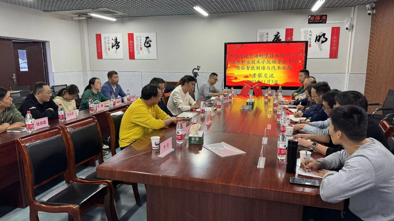 交流会上,智能制造与汽车学院院长叶勇、副院长王勇等分别介绍了我院基本情况,并就师资队伍建设、双高项目实施、人才培养等相关方面的经验与做法进行了分享,书记陈飞及主任吴志光分别介绍了上海科学技术职业学院及池州职业技术学院的相关历史、师资情况和实训条件,并分享了当前各自学校的办学经验。与此同时,就机电一体化专业建设、中德SGAVE项目开展情况、工业机器人技术专业人才培养方案、智能网联专业开展、实训室建设、学院招生就业等开展了深入的交流与探讨。并在自动化系副主任张伟、汽车工程系副书记杨帅陪同下参观了学院的PLC控制技术实训室,自动化生产线安装与调试实训室,生产线与工业机器人技术实训室,机器视觉与工业机器人技术实训室等。来宾们对学院的校园环境、教学设施、浓厚的文化氛围给予了高度评价。