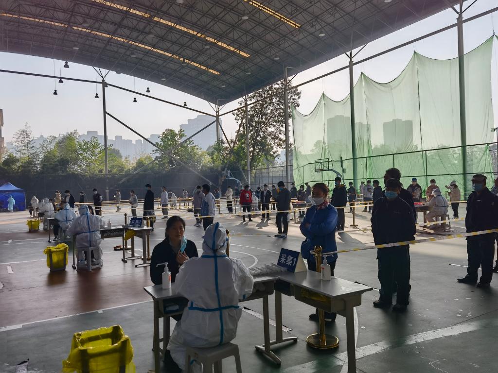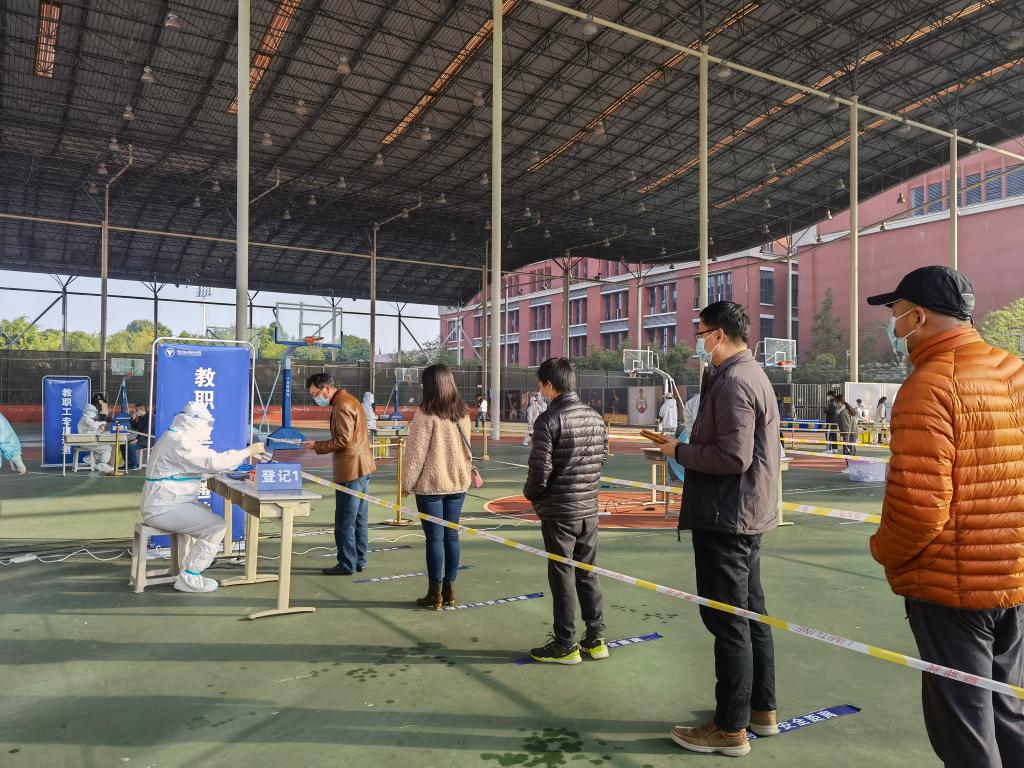为进一步做好校园疫情的排查和处置,落实疫情防控“早发现、早报告、早隔离、早治疗”的四早措施,学校疫情防控工作领导小组第一时间部署并启动全校全员核酸检测方案,11月10日至12日连续三天对全校教职员工和校内相关人员进行集中核酸检测标本采集。校园核酸集中采样点设置在学校通风良好的风雨蓝球场,检测现场规范设置等待区、登记区、采集区、物资存放点和医废暂存点。检测过程中,全体人员佩戴口罩,适时对各区域进行消毒,相关工作人员和志愿者全程维护秩序,提醒大家注意间隔1米距离,避免扎堆,完成采样后按照指定路线离开,切实保障了核酸检测工作的高效有序进行。截止12日下午,全校共计26000余人完成了核酸检测采样。此次核酸检测对象实现校内人员全覆盖,包括教师、学生、物管人员、食堂工作人员、在校离退休人员和家属等,检测结果均为阴性。