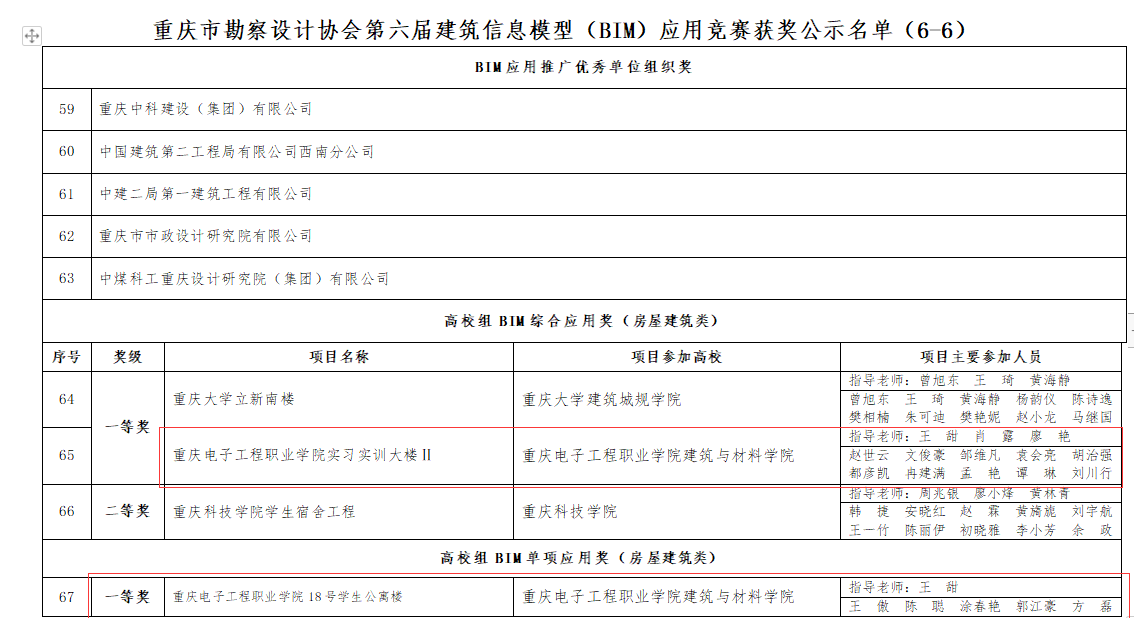 2021年11月,重庆市勘察设计协会第六届建筑信息模型(BIM)应用竞赛组委会经过既定的评审程序,在众多优秀作品中,评选出企业组“BIM综合应用类”一等奖8项、二等奖11项、三等奖15项;“BIM单项应用奖”一等奖5项、二等奖5项、三等奖6项;高校组“BIM综合应用类”一等奖2项、二等奖1项;“BIM单项应用奖”一等奖1项;“BIM应用推广优秀单位组织奖”13家。