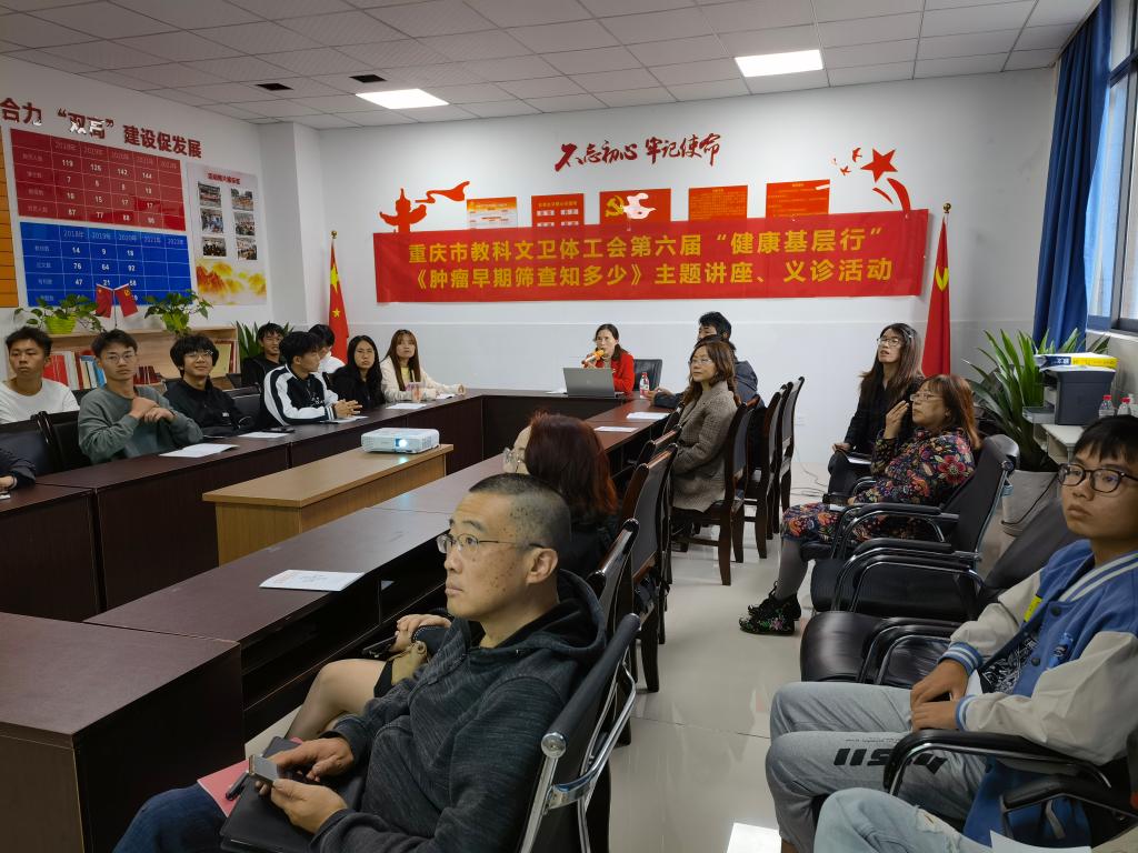 10月21日下午,来自重庆市肿瘤医院的专家团队以《肿瘤早期筛查》为主题开展了第一期活动,肿瘤医院体检中心张主任为大家详细的讲解了肿瘤早期筛查与预防的相关知识,讲座后老师们积极踊跃的咨询张主任肿瘤方面的问题。随后专家团队也带来了专业的检测仪器,搭建了临时体检区,为在场的教职工们开展了针对甲状腺的健康筛查。