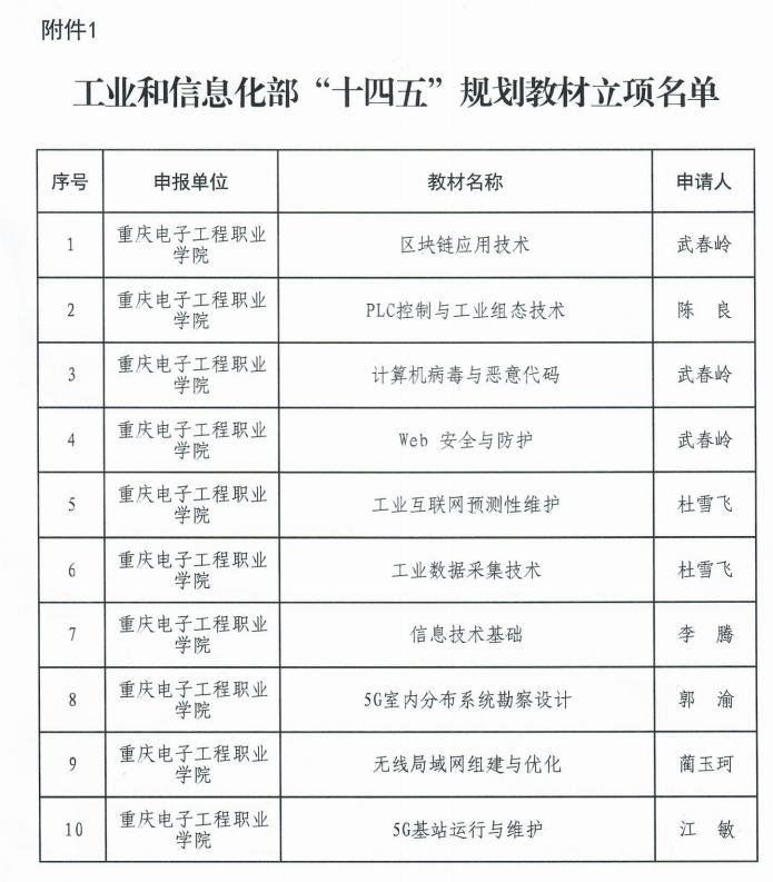 近日,接《工业和信息化部关于“十四五”规划教材立项建设的通知》(工信部人[2021]116号),工业和信息化部组织开展了教材立项的评选工作,此次经学校申报、形式审查、专家评审,工业和信息化部审核批准“十四五”规划教材立项。pg国际10部教材获工业和信息化部“十四五”规划教材立项,这是pg国际开展“双高建设”和“提质培优计划”工作以来取得的又一教材建设重要成果。