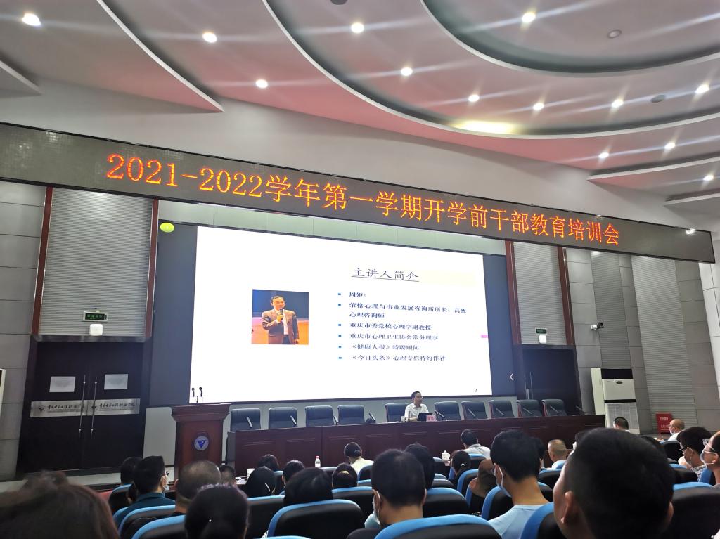 教育培训环节主要围绕两个专题讲座进行。学校邀请到重庆市委党校心理学主讲教师、重庆市首家专业心理咨询机构荣格心理与事业发展咨询所创始人周矩为大家作了题为《领导干部压力管理与心理调适》的心理辅导讲座。周矩老师从充分认识心理健康问题的重要性,摆脱狭隘思想束缚、提高心理调适能力,如何有效进行心理调适管理等方面展开讲述,用风趣幽默的语言、简单易懂的方式讲解了复杂的心理学理论,疏导了大家在工作、生活中产生的情绪问题,结合真实案例,为大家调节好心理、保持积极健康的阳光心态开出多剂良方。整堂讲座都在轻松和谐的气氛下进行,让大家既能理性思考,又能在新学期之初轻装上阵,把心思放在谋发展上,把精力用在干事业上,用良好的心态开创重电各项事业发展新局面。