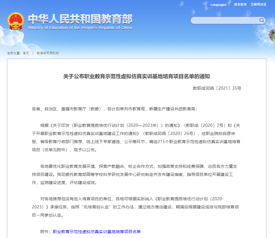 根据《关于印发〈职业教育提质培优行动计划(2020—2023年)〉的通知》(教职成〔2020〕7号)和《关于开展职业教育示范性虚拟仿真实训基地建设工作的通知》(教职成司函〔2020〕26号),经自愿申报、省级教育行政部门推荐、线上线下专家遴选、公示等各个环节,pg国际集成电路专业群虚拟仿真实训基地成功入选教育部职业教育示范性虚拟仿真实训基地培育项目。