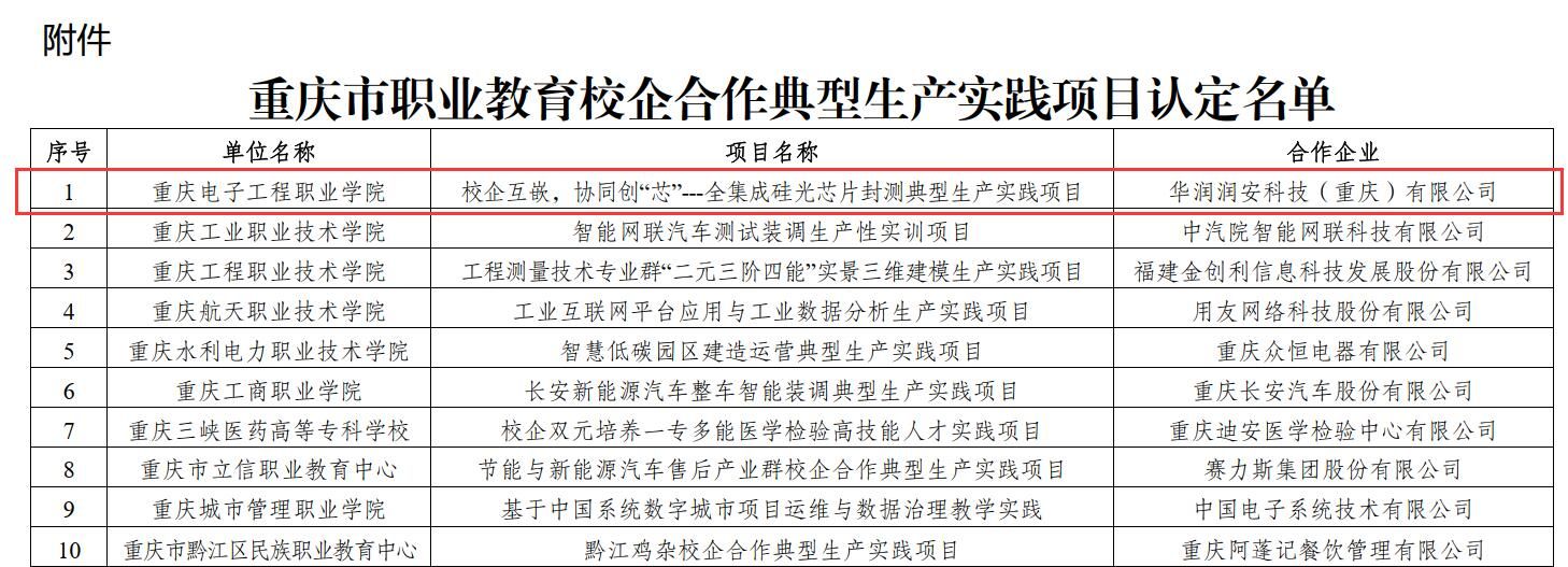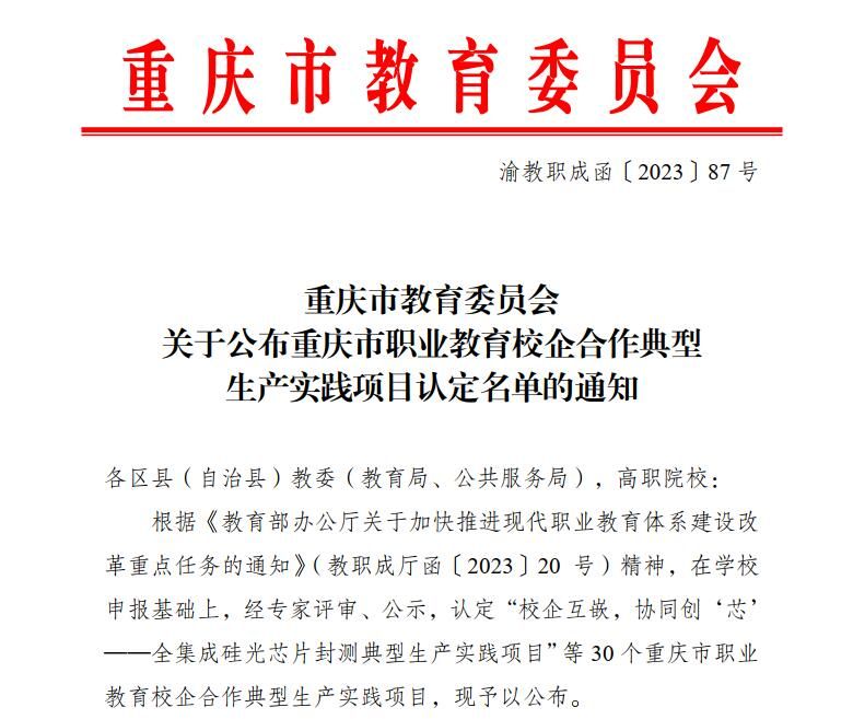 近日,重庆市教育委员会发布《重庆市教育委员会关于公布重庆市职业教育校企合作典型生产实践项目认定名单的通知》,pg国际“校企互嵌,协同创‘芯’——全集成硅光芯片封测典型生产实践项目”等30个项目入选重庆市职业教育校企合作典型生产实践项目。