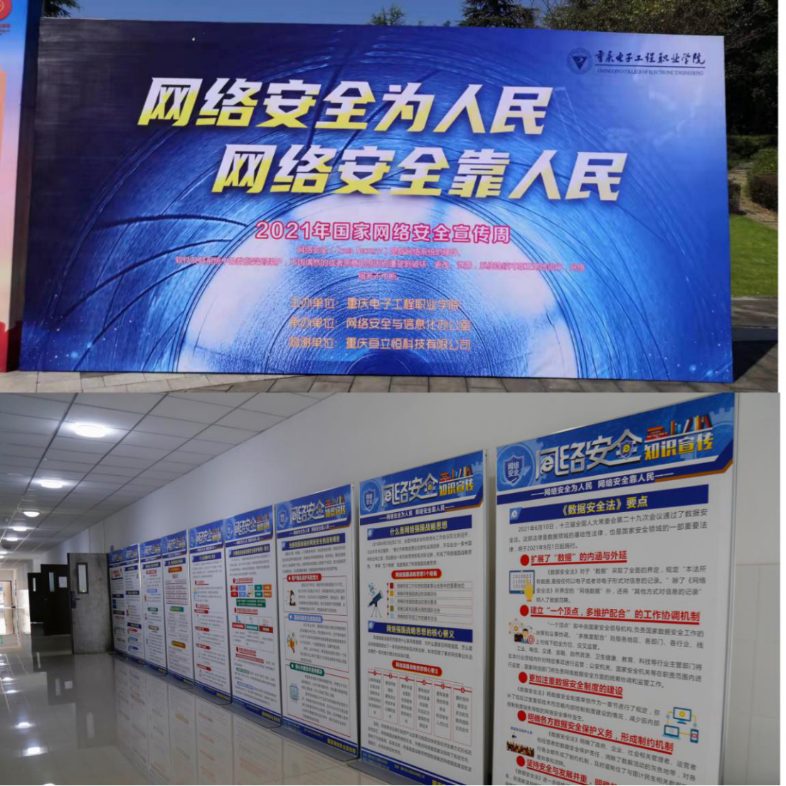 根据《2021年重庆网络安全宣传周活动总体方案》的要求,结合中共中央办公厅、国务院办公厅《关于加强网络文明建设的意见》的精神,在2021年国家网络安全宣传周期间,重庆电子工程职业学院于2021年9月26日至30日,开展了形式多样的网络安全宣传教育推广活动。该活动在重庆市教委科技处和重庆市公安局沙坪坝分局的指导下,由学校网络安全与信息化办公室牵头,协同校党委宣传部、党委学生工作部等部门进行了组织策划,全校师生通过不同方式参与了此次宣传推广活动。