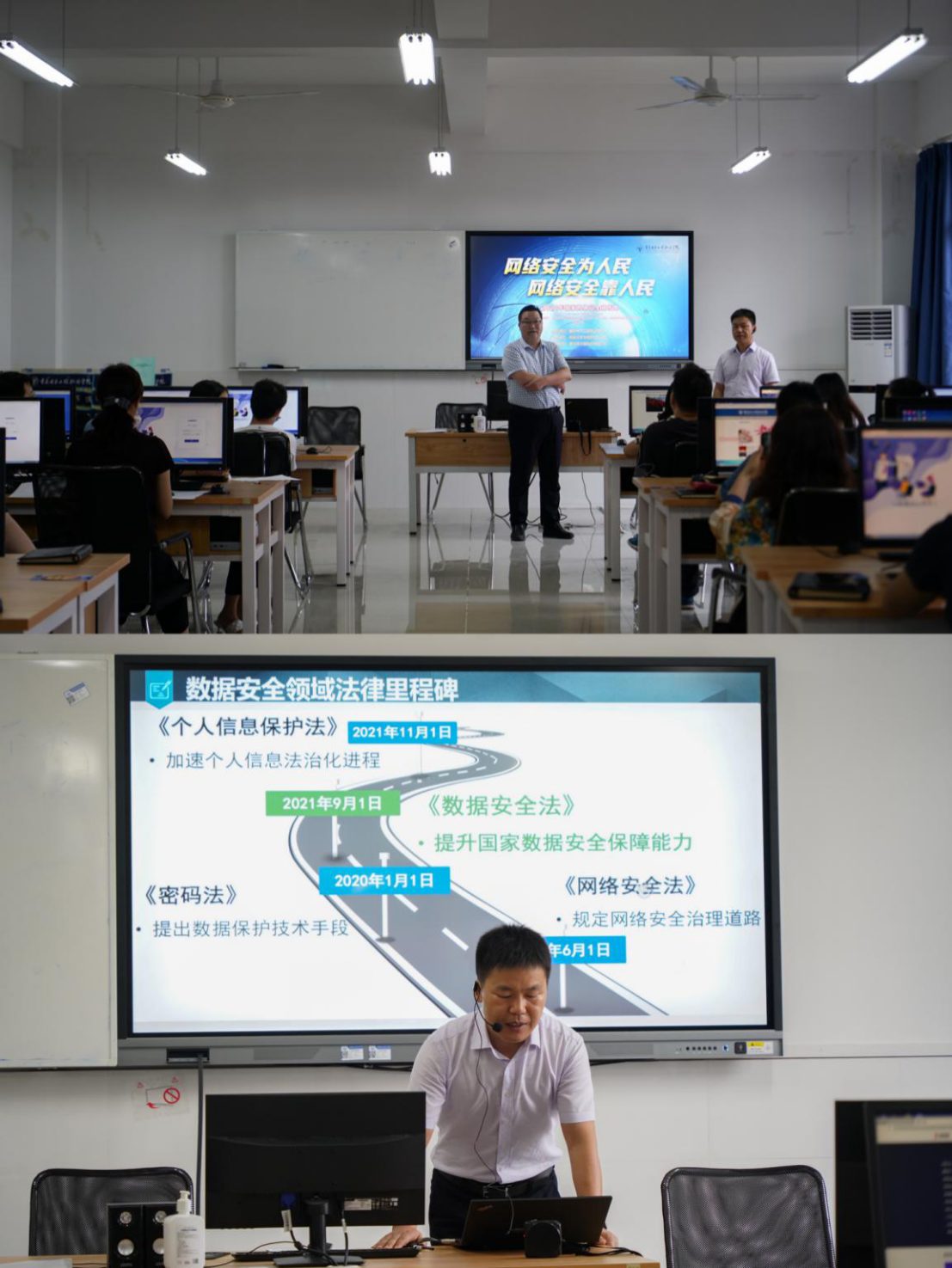 作为学校“网络安全宣传周”的一项重要内容,9月27日,学校在15405室召开了2021年网络安全宣传周动员大会,来自学校各职能部门和二级学院的近60名信息化联络员参加了此次大会。网络安全与信息化办公室李林主任做了宣传动员,网络安全专家岳建堂老师对全体参会人员开展了《个人信息保护法》《数据安全法》的普法培训。学校刘成俊副校长全程参加了此次培训学习。