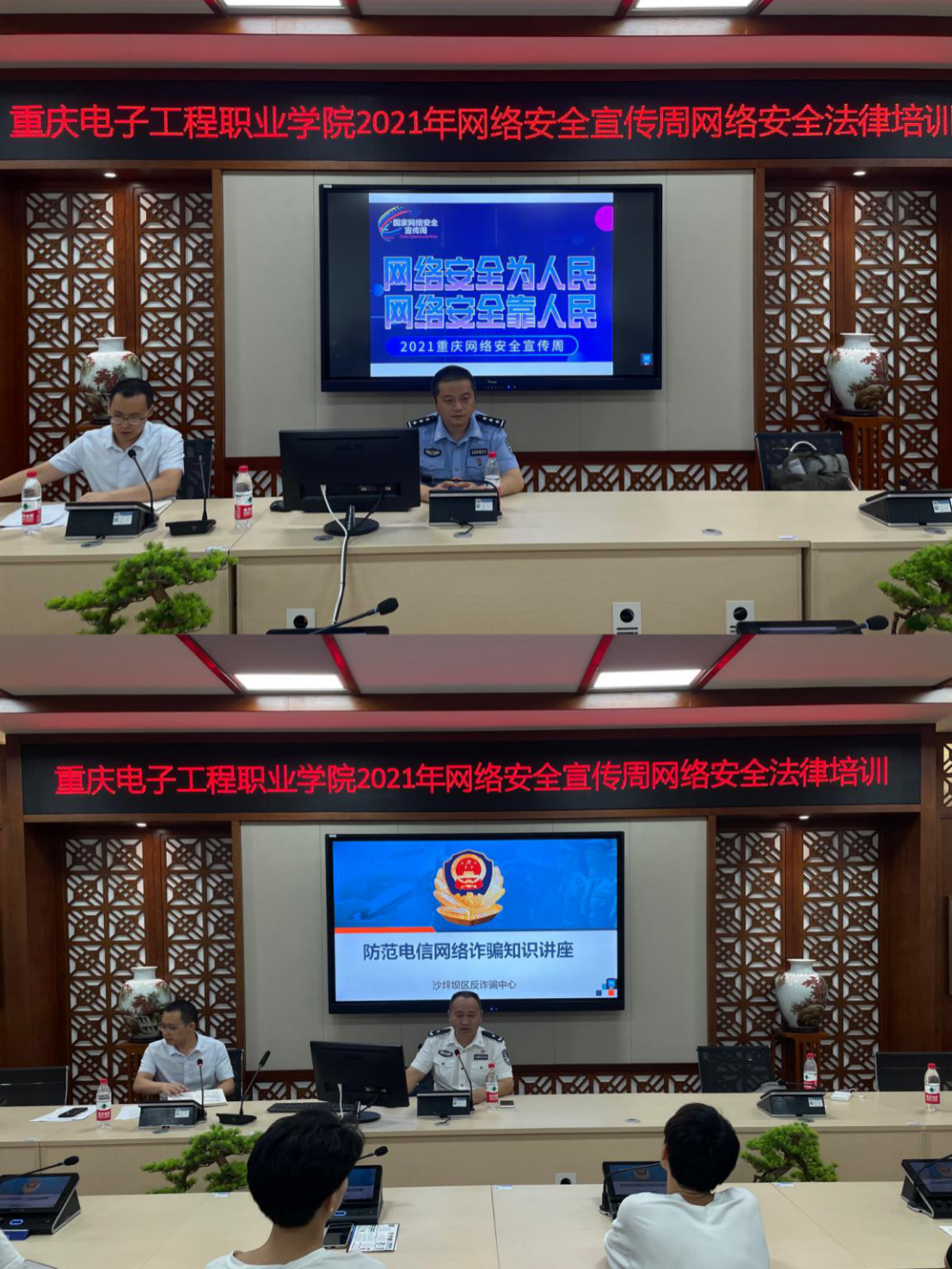 本届宣传周活动以“网络安全为人民,网络安全靠人民”为主题,采取“线上线下”相结合的宣传模式,开展了信息化联络员网络攻防知识竞赛,校教务处、后勤管理处、校团委的联络员代表分获前三名。邀请了沙坪坝公安分局的专家对人工智能与大数据学院、电子与物联网学院、通信工程学院的学生进行了网络安全专题讲座。学校选拔并训练了42名师生代表,参加了“2021年重庆教育系统网络安全宣传周网络安全攻防竞赛”。通过开展线上网络安全专题培训、加固建设学校门户网站和学校LED视频直播平台网络安全专栏宣传等形式,拓展了师生学习网络安全知识的渠道,增强了师生的网络安全意识,建立了网络安全教育长效机制。此外,学校还通过各单位电子屏、海报、易拉宝、发放宣传材料等方式开展线下的网络安全专题知识推广普及,进一步增强了师生的网络安全防范意识和自我保护技能,提高了师生全员参与网络安全工作的积极性、主动性、自觉性。