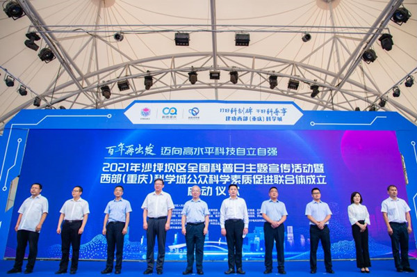 9月15日,由重庆市沙坪坝区人民政府、四川省成都市武侯区人民政府联合主办,沙坪坝区科协,有关区级机关等承办的2021年沙坪坝区全国科普日主题宣传活动暨西部(重庆)科学城公众科学素质促进联合体成立启动仪式在沙坪坝区学府广场举行。重庆市科协二级巡视员袁强,沙坪坝区委常委、区政府党组成员蔡焘,重庆大学副校长明炬等领导出席启动仪式。学校副校长刘成俊作为联合体常务理事单位代表应邀参加了仪式。