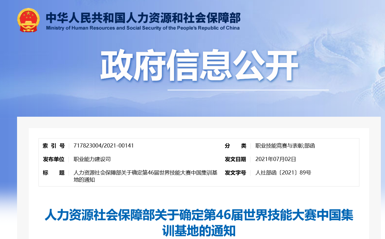 7月6日,人力资源和社会保障部函[2021]89号文件发布,经第46届世界技能大赛中国组委会研究,确定在江西洪都航空工业集团有限责任公司等245家单位设立346个第46届世界技能大赛中国集训基地。其中重庆电子工程职业学院获批设立第46届世界技能大赛光电技术项目中国集训主基地。