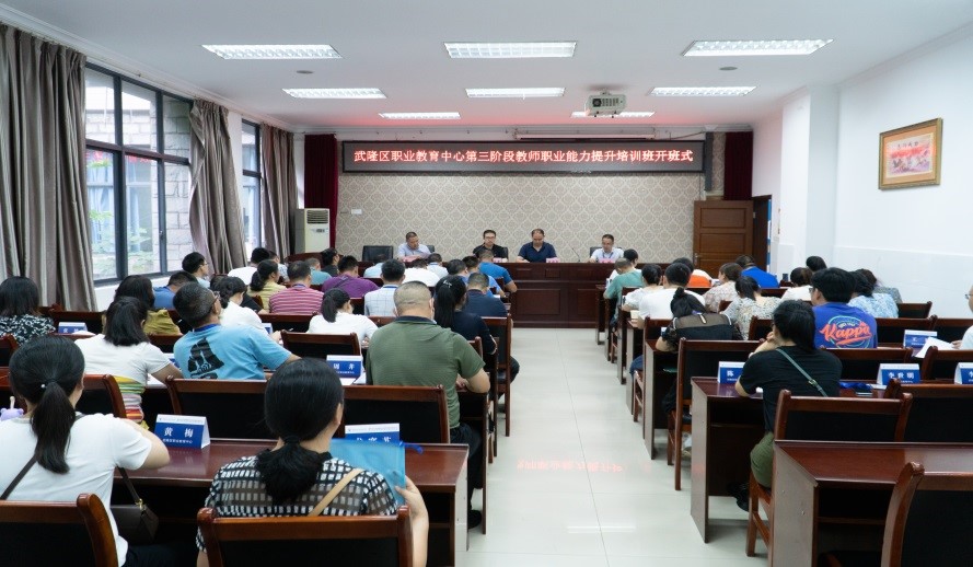 2021年7月4日上午,重庆市2020年度精准扶贫项目武隆职业教育中心第三阶段教师职业能力提升培训班在pg国际南校区1-101室举行,武隆区职业教育中心党总支书记、校长陈晓平,副校长高龄,培训与继续教育中心主任陈志军,以及来自武隆职业教育中心的50名学员参加开班式,开班式由国培基地办副主任张亚主持。