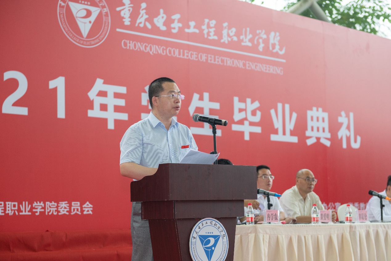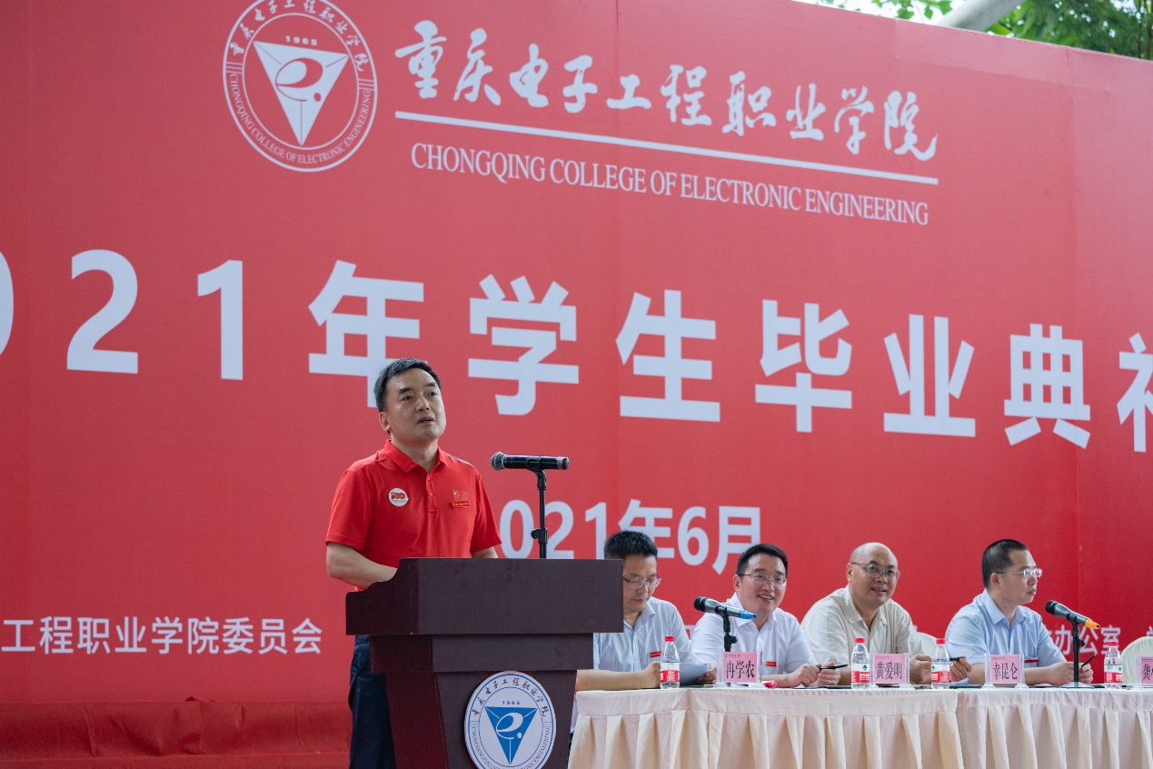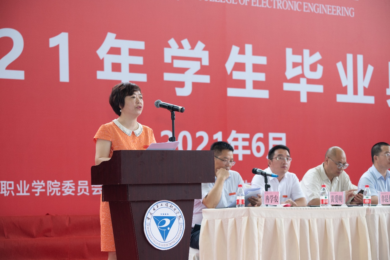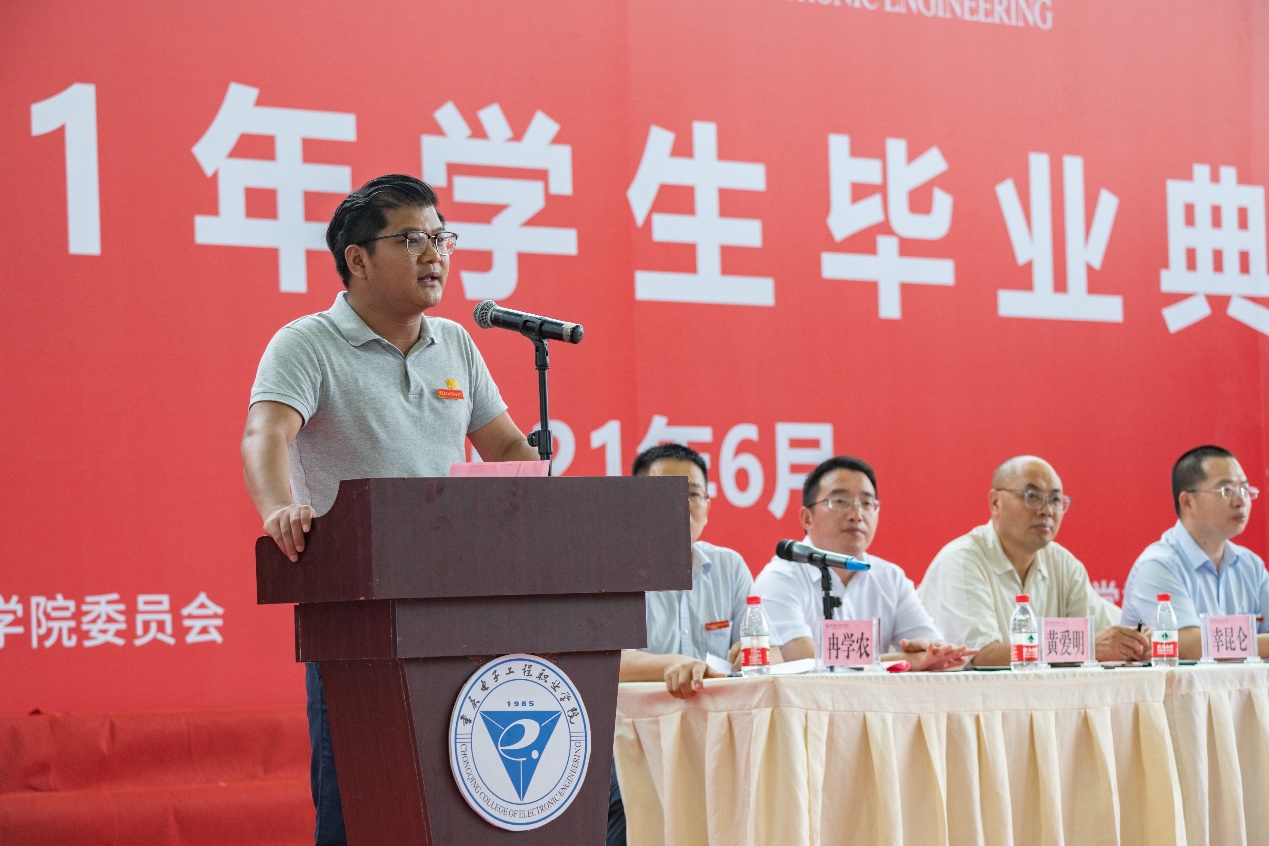党委书记孙卫平致辞。他颇有感触地说到,“同学们,再过6天,我们即将迎来中国共产党成立100周年。感恩百年峥嵘岁月,中国共产党带领全国人民走出了一条险峻而壮丽、艰辛而宽广的中国道路,为同学们创造了美好幸福的生活,我们也特别期待你们未来精彩的人生演绎。建党100周年之际,你们都还是20多岁的青年;新中国成立100周年之时,你们也只有50岁左右;建校100周年之机,你们也才60出头,希望我们在建校100周年时能够重聚重电!同学们,母校将成为你们浓重的乡愁,你们将成为母校永远的牵挂。”