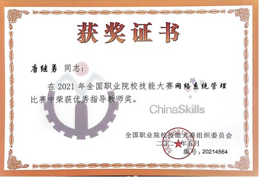 图2 荣获网络系统管理赛项优秀指导教师奖证书