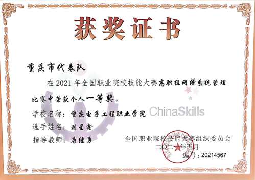 6月20日至25日,2021年全国职业院校技能大赛高职组“网络系统管理”赛项在山东举行,共有来自全国的30支代表队参赛。重庆电子工程职业学院人工智能与大数据学院教师唐继勇带领刘星鑫同学组成的代表队参加此次比赛,刘星鑫同学以优异成绩荣获一等奖。