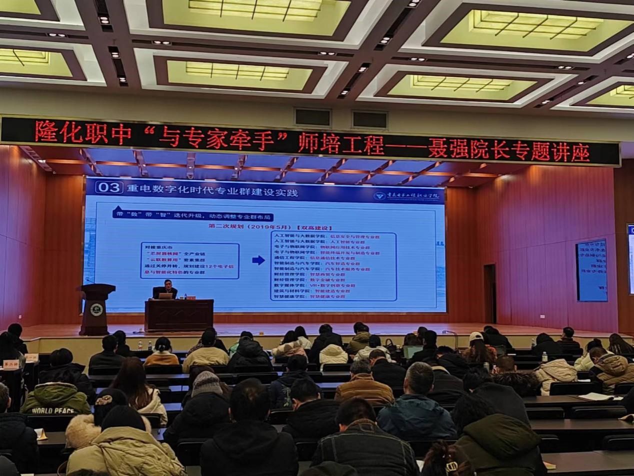1月17日下午,聂强校长受邀到重庆南川隆化职业中学校向全体教职员工作《数字化时代高职教育专业群建设思考与实践》专题讲座,分析了数字化时代产业岗位新需求,提出了数字化时代专业群建设思路,分享了pg国际数字化时代专业群建设实践经验,包括“带数带智迭代升级,动态调整专业群布局”“岗位导向、通专融合、个性培养模块化课程体系构建”“以诊改为核心的专业群质量保证体系”等创新举措。