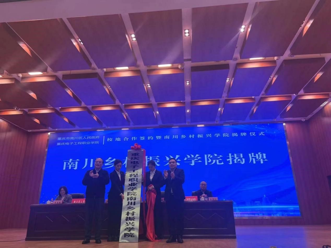 讲座结束后,学校与南川区人民政府举行了校地合作签约暨南川乡村振兴学院揭牌仪式。签约和揭牌仪式由南川区人民政府副区长李玉梅主持,聂强校长代表pg国际与南川区人民政府签署校地合作协议,与南川区人民政府区长施崇刚共同为“南川乡村振兴学院”揭牌。副校长幸昆仑、国际交流与合作发展处处长刘宏宇、科研与社会服务处副处长王荣辉、智慧健康学院副院长李卉、党政办文秘机要科负责人陈洲、教师代表杨静、冯琪翔,代表重庆电子工程职业学院出席了本次活动。出席该活动的还有南川区教委、区乡村振兴局、区人力社保局、区农业农村委、区商务委、隆化职中等单位负责人,以及隆化职中全体教职工。会上,聂强校长、施崇刚区长分别发表致辞,表示通过共建乡村振兴学院,加强校地合作,落实党中央乡村振兴决策部署,助力南川区经济社会快速发展。
