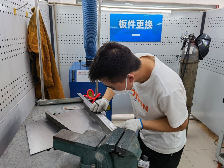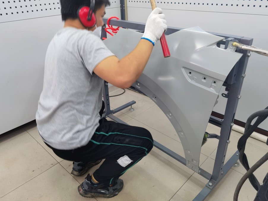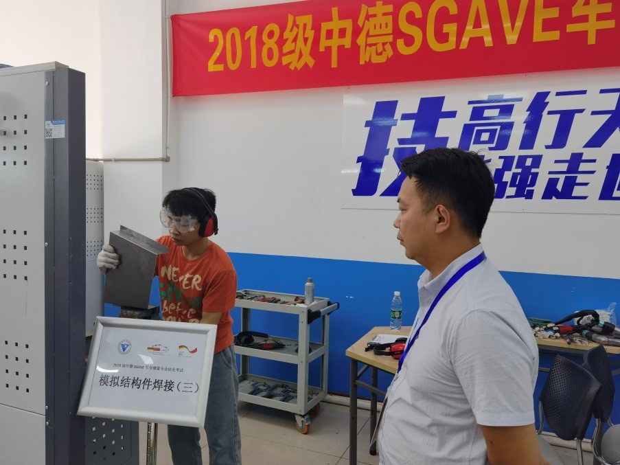 本次结业考试试题是由德方开发,采用基于客户委托过程的考核方式,采用统一考核平台综合考评。结业考试分为理论和实操两个部分,理论共25道题目,采用闭卷形式考核,实操为模拟结构件更换和汽车翼子板修复两个任务,每个工位需要完成任务分析、任务计划、任务实施、任务检查四个步骤,其中模拟结构件更换项目,考生需要在规定时间内完成工件的切割、划线、定位、打磨、钻削、打孔、焊接等工艺流程。汽车翼子板修复项目考生需要在规定时间内对损伤的翼子板实现完全修复达到喷漆水平,考核学生的综合损伤评估及修复能力。考核过程中,每个工位分别由一名企业技术专家和一名学院教师担任考官,且两位考官均需获得SGAVE项目考官认证。结合上学期的中期考试成绩,通过SGAVE项目结业考试的学生将获得由国家教育部颁发的SGAVE项目证书和毕业证书。