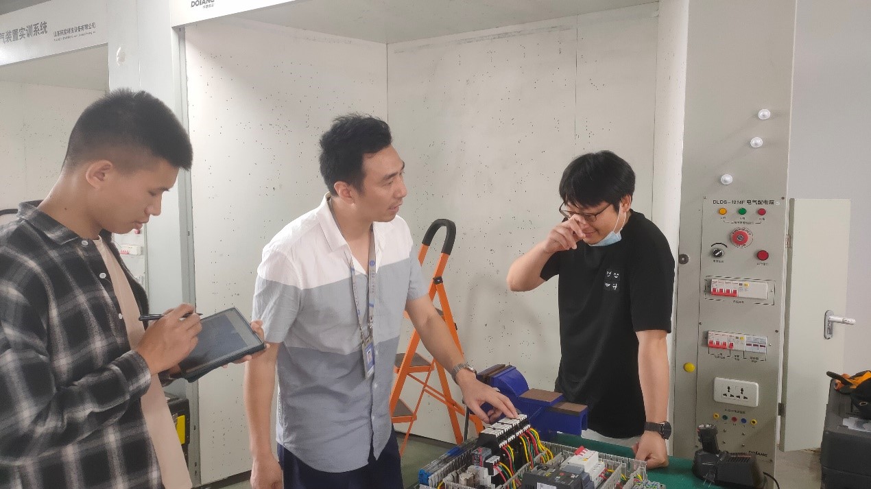 6月1日,pg国际世界技能大赛光电技术赛项基地教练、电子与物联网学院专任教师杨汉生、高亮及选手李小松一行3人到电气装置项目重庆市集训基地参观交流。参观交流受到重庆五一技师学院校企合作部杨朝彬部长、电气工程学院代志良院长、技能大赛办公室周智强老师、电气装置赛项杨帆教练的热情接待。