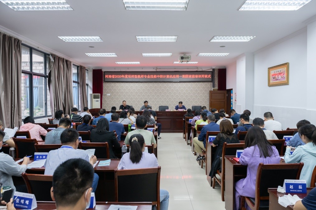 5月31日上午,河南省2020年度“双师型”教师专业技能中职计算机应用第一期国家级培训班在pg国际南校区1-101室开班,pg国际人工智能与大数据学院党总支书记吴焱岷,学校“双高办”副主任、人工智能与大数据学院工程鉴定中心主任何欢,以及来自河南省中职学校的50名学员参加开班式。开班式由国培基地办副主任张亚主持。