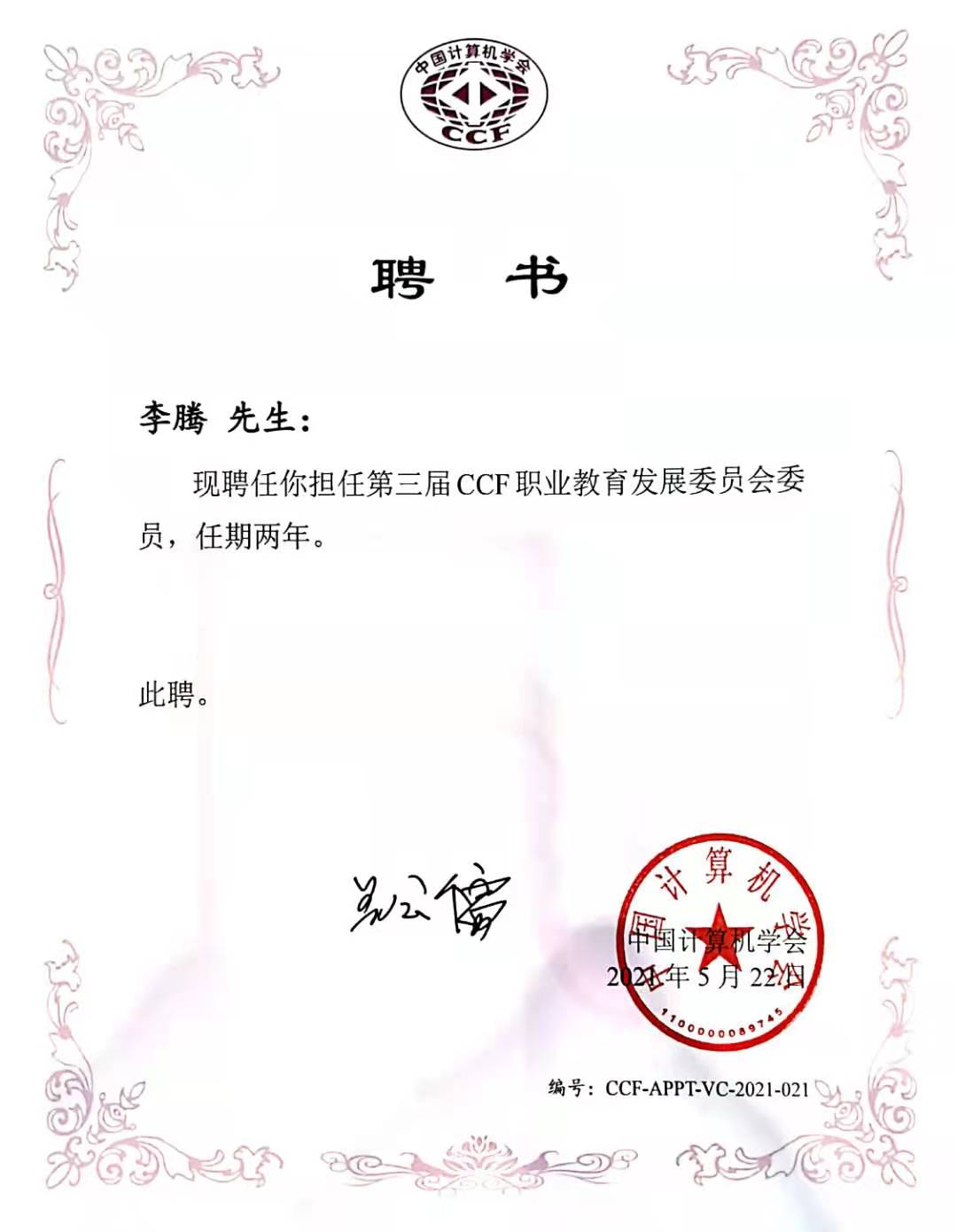本次会议由中国计算机学会(CCF)主办,CCF职业教育发展委员会承办,山东电子职业技术学院协办。会议分为“课堂革命”、“课程思政”专题论坛,并举办了第三届CCF VC换届会议及三届一次常委扩大工作会议。人工智能与大数据学院云计算技术应用专业带头人李腾被聘为第三届CCF职业教育发展委员会委员。