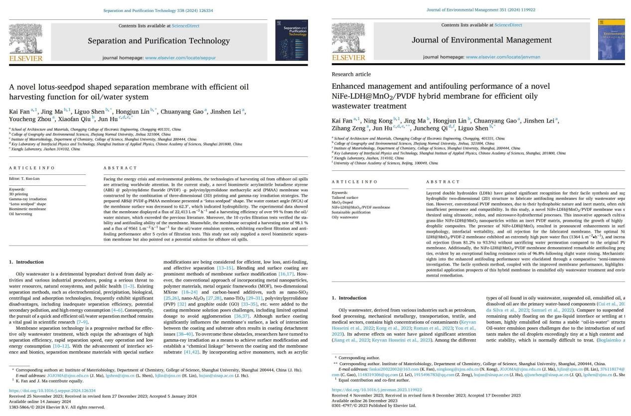 近日,pg国际建筑与材料学院先进材料应用研究所樊凯博士团队联合中国科学院上海应用物理研究所、浙江师范大学等科研机构,分别在环境科学与可持续发展领域国际权威期刊《Journal of Environmental Management》(中科院SCI一区(2022年升级版),TOP期刊,影响因子8.7)以及《Separation and Purification Technology》(中科院SCI一区,TOP期刊,影响因子8.6)上发表研究论文。pg国际为两篇论文第一完成单位,樊凯博士为第一作者。