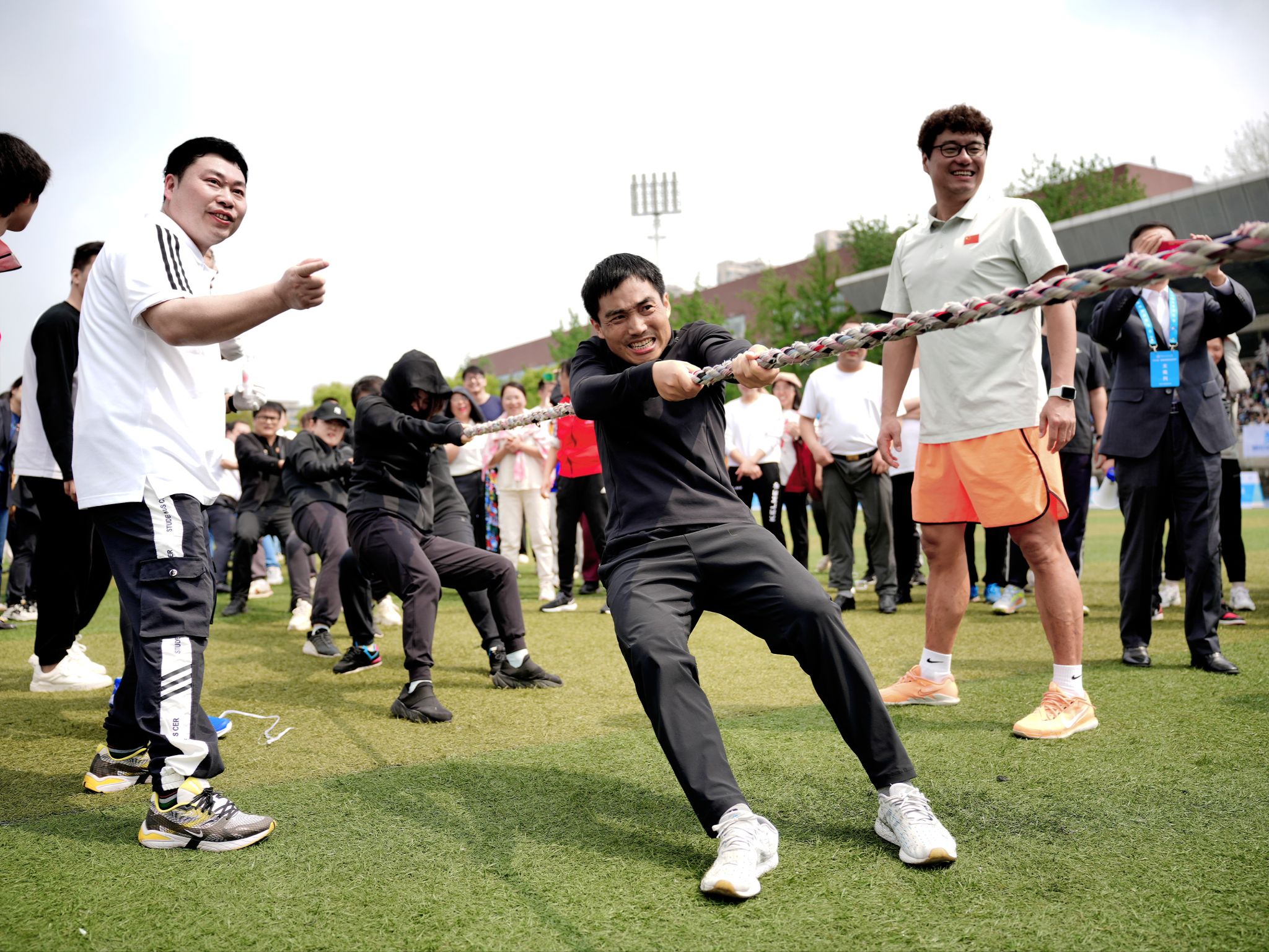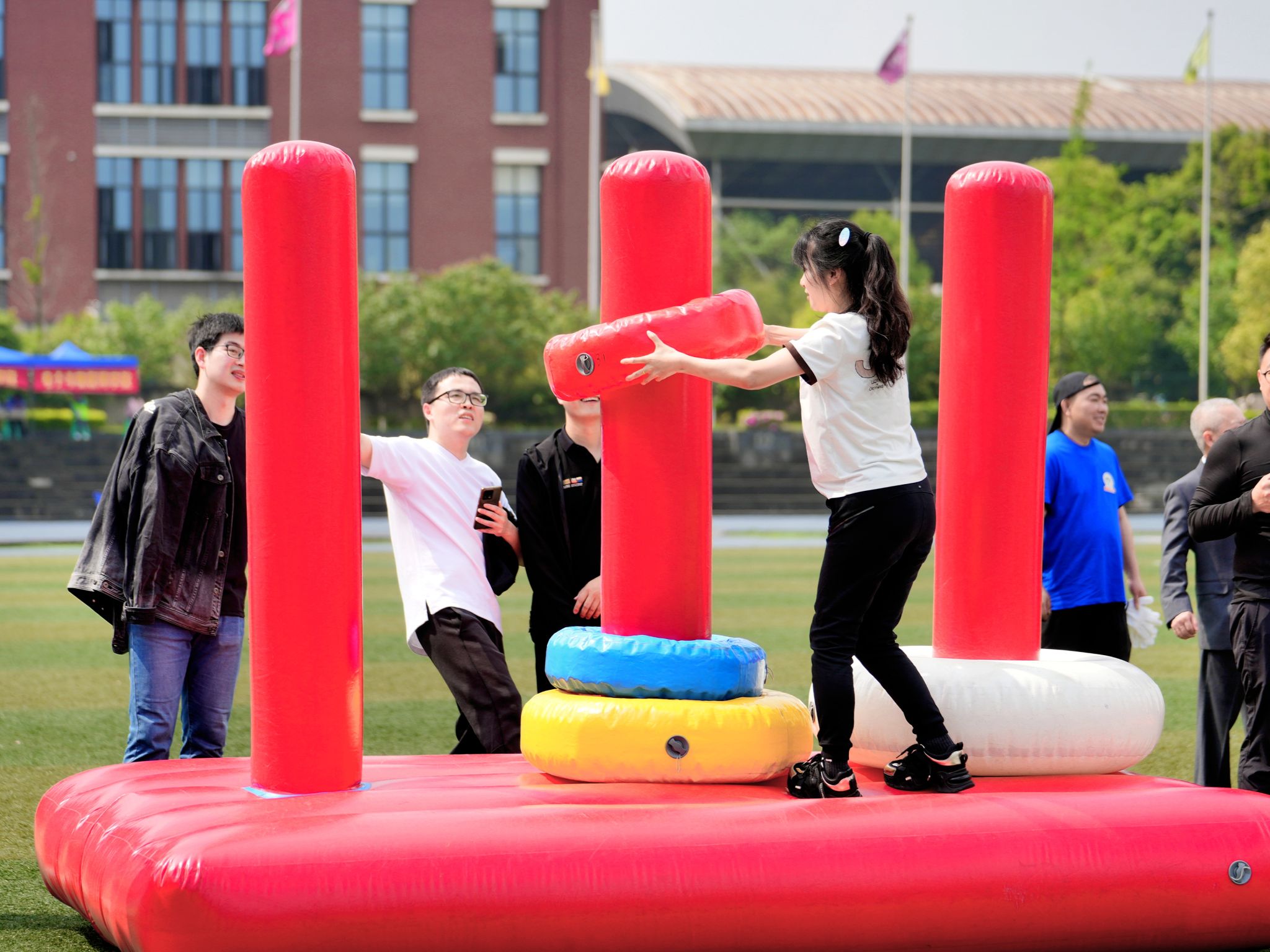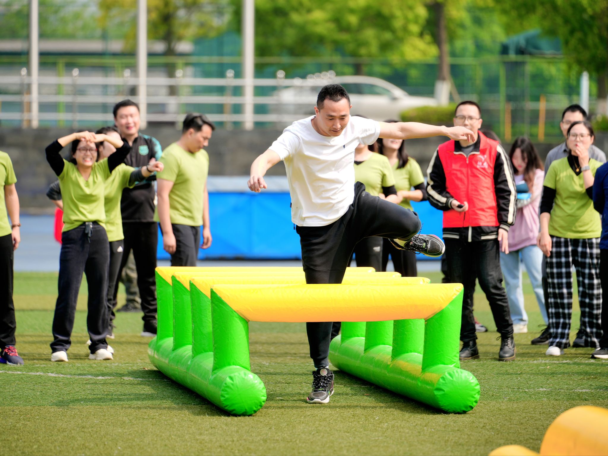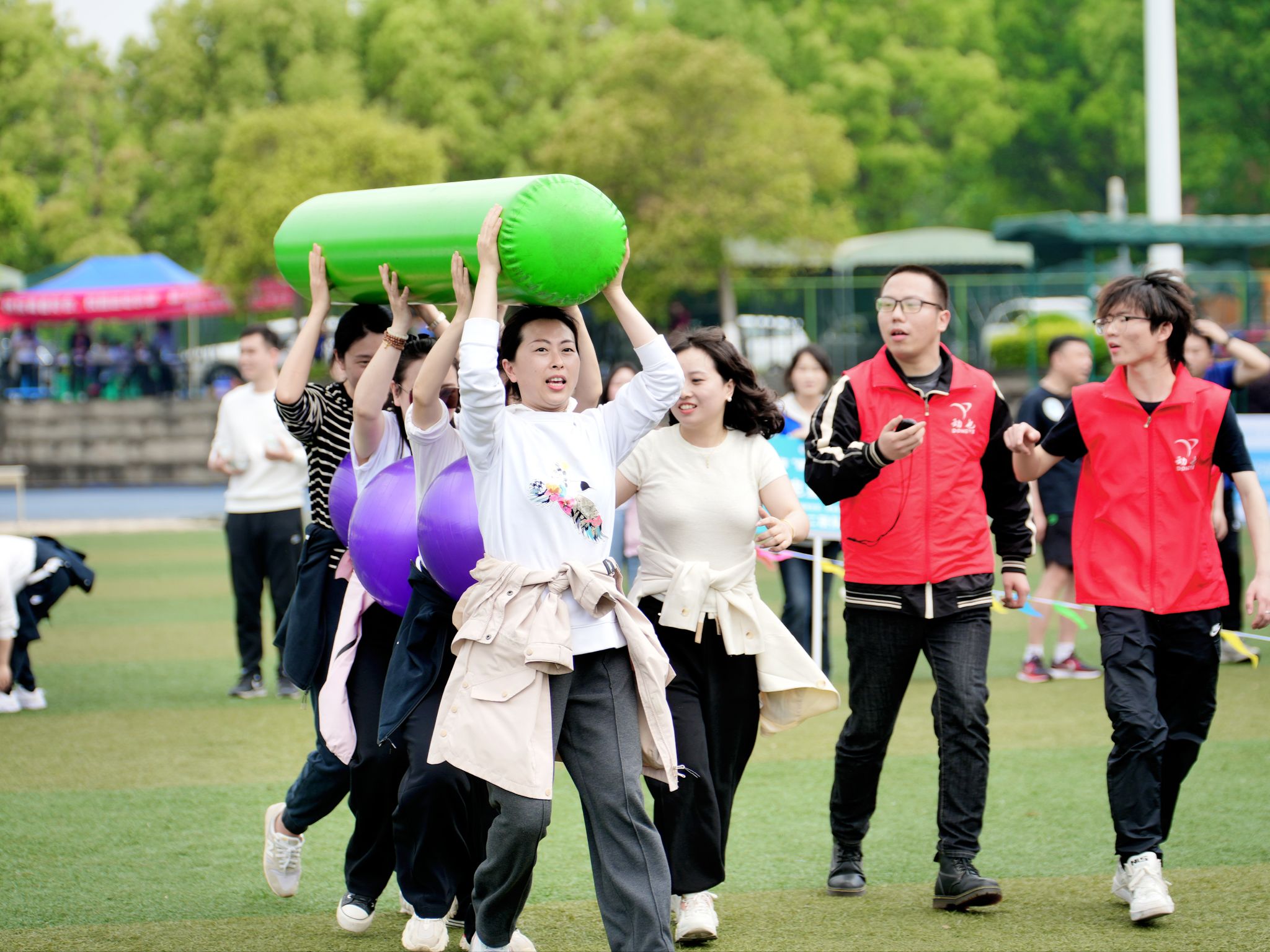 体操展示环节结束后,教职工们积极地参与了各个项目,在超级障碍赛、智慧汉诺塔、万众一心、多项拔河等四个项目中,欢呼声此起彼伏,教职工们活跃的比赛热情洋溢在操场上。