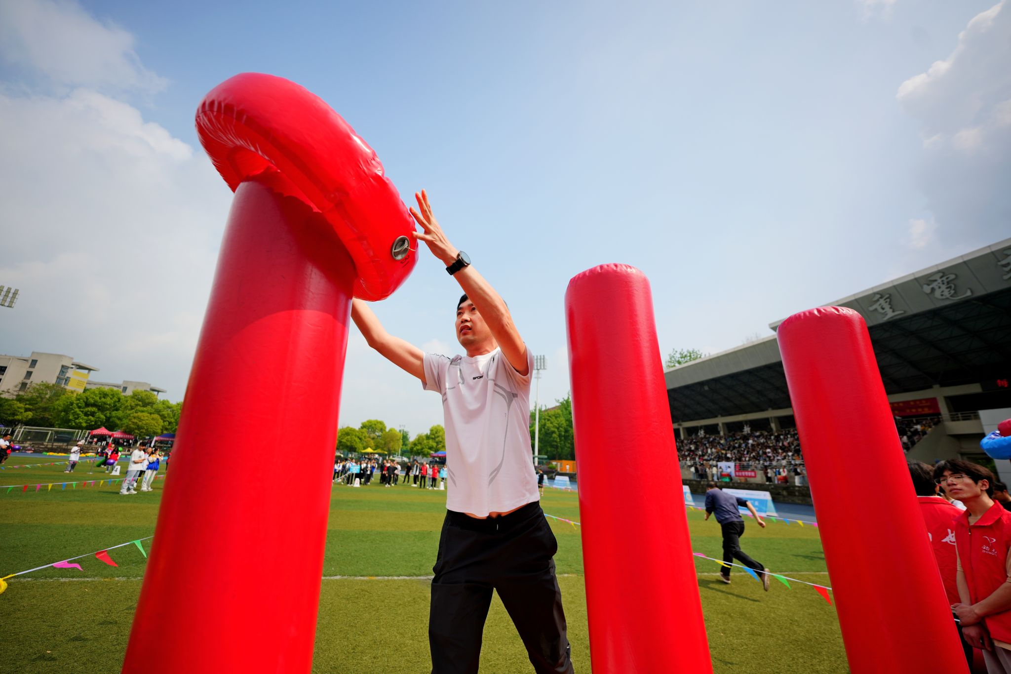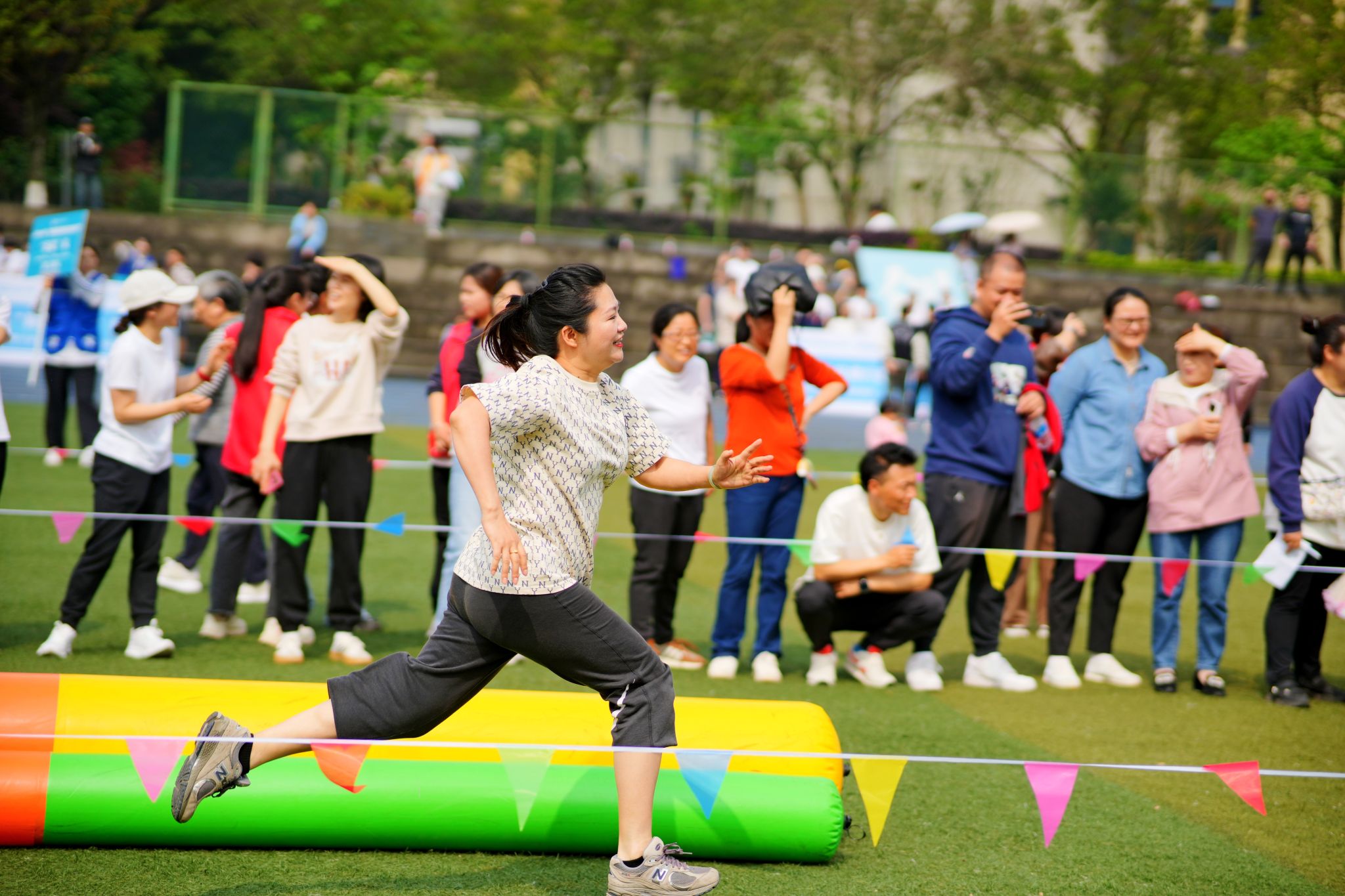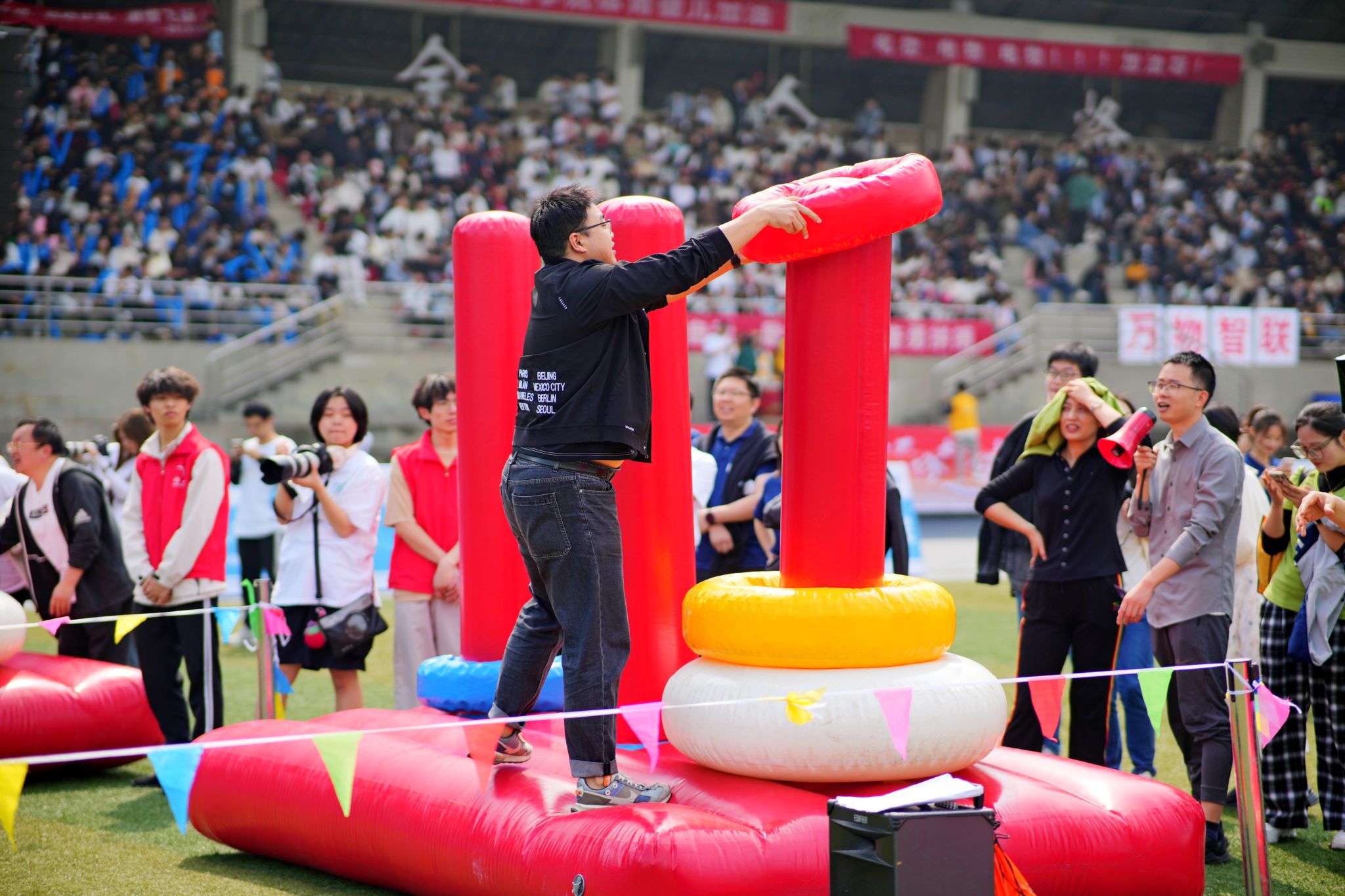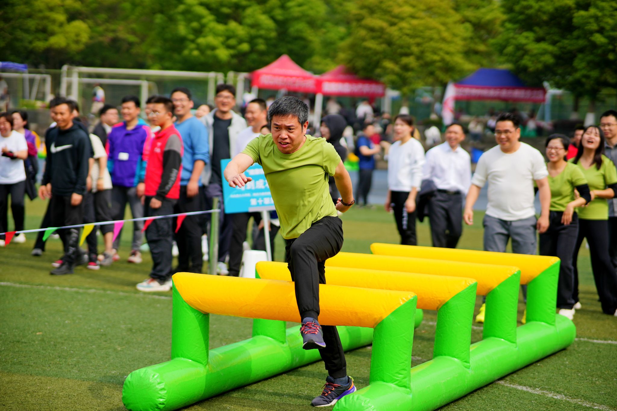体操展示环节结束后,教职工们积极地参与了各个项目,在超级障碍赛、智慧汉诺塔、万众一心、多项拔河等四个项目中,欢呼声此起彼伏,教职工们活跃的比赛热情洋溢在操场上。