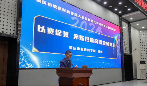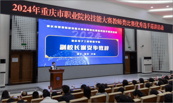 为弘扬践行新时代教育家精神,进一步发挥全国职业院校技能大赛教师类比赛优秀选手的示范引领作用,深入推进“三教”改革,整体提升全市职业院校教师教学能力、数字素养、教学设计水平,以“躬耕教坛·强国有我·以赛促教·良匠之师”为主题的重庆市职业院校技能大赛教师类比赛优秀选手第一场巡讲活动于2024年4月22日下午在重庆电子工程职业学院博远厅成功举行。重庆市教育科学院教研员付勇,重庆电子工程职业学院党委委员、副校长谢义华,教务处处长童世华,2023年全国职业院校技能大赛教学能力比赛一等奖团队代表重庆工商职业学院甘诗源、重庆电子工程职业学院吴伟龙,以及重庆市28所高职院校280余名教师代表出席了会议,会议由重庆电子工程职业学院王聃黎老师主持。