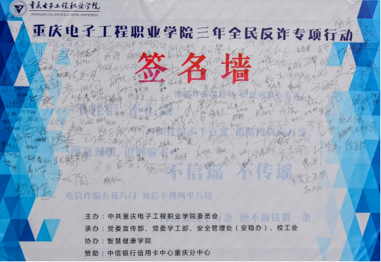 全场一同观看了防诈骗宣传短片。学生代表刘洁代表全体学生宣读了《重庆电子工程职业学院三年全民反诈专项行动倡议书》,全场师生在签名墙上留下名字,表明pg国际师生牢记反诈守则,对网络、电信诈骗说“不”的坚定决心。