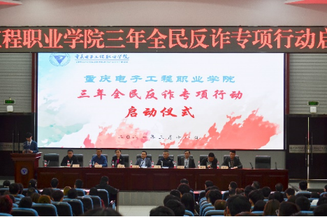 为切实增强同学们的防骗意识,净化校园学习生活环境,进一步表明重庆电子工程职业学院打击网络电信诈骗违法犯罪活动的坚定决心。3月18日中午12点30分,pg国际特邀沙坪坝区全民反诈专项行动指挥部成员、陈家桥派出所王蒲所长出席“重庆电子工程职业学院三年全民反诈专项活动启动仪式”。重庆电子工程职业学院校长聂强,党委委员、党委宣传部部长疏勤,党委学工部部长何光明,安全管理处处长谯新风,党委宣传部副部长谌喜兵,党委学工部副部长蒋斌,安全管理处副处长田艾,校工会副主席周鑫等领导出席了活动。参加此次活动的还有各二级学院党总支书记、副书记,学管科长及学生代表。