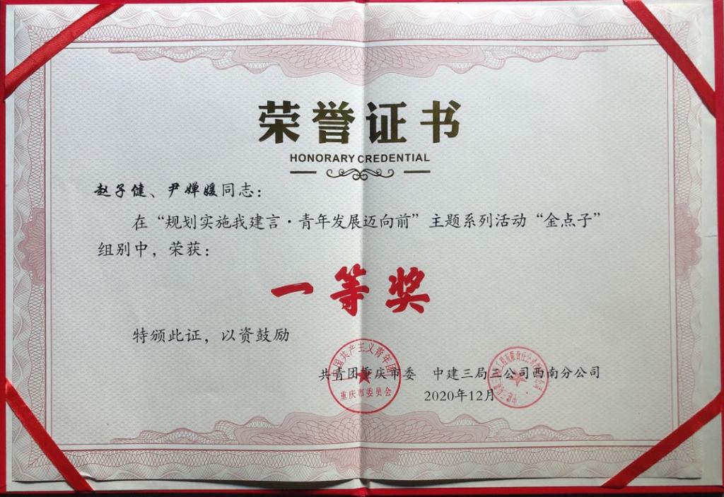 2020年12月“规划实施我建言·青年发展迈向前”主题系列活动圆满落下帷幕,pg国际建筑与材料学院教师尹婵媛、学生赵子健在此次活动“金点子”组别中取得重庆市一等奖。