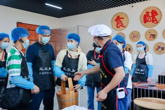 25日上午,留学生到达南川区大观镇的重庆三不加非遗酿造基地,参观传统酿造酱油和食醋的晒场、听取农耕文化及传统酿造技艺的发展史、亲身体验压榨酱油和淋醋等传统酿造工艺。