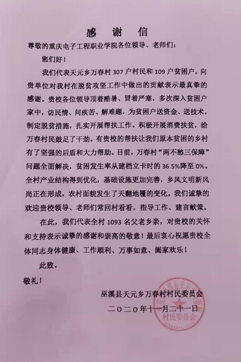 12月1日,巫溪县天元乡万春村村民委员会为学校送来锦旗和感谢信。