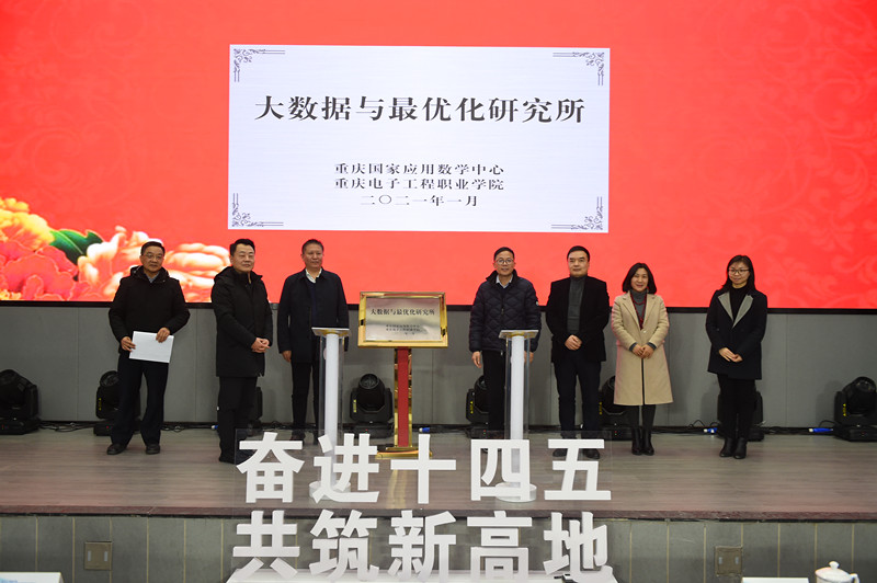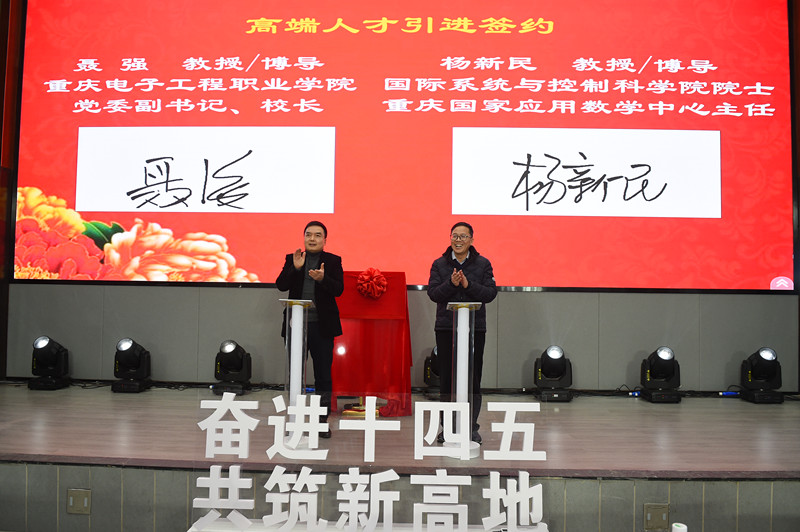 会上,杨新民教授受聘为学校特聘教授并举行了签约仪式,在全体与会人员的共同见证下,受聘的杨教授与孙卫平书记共同为重庆国家应用数学中心重庆电子工程职业学院“大数据与最优化”研究所揭牌。