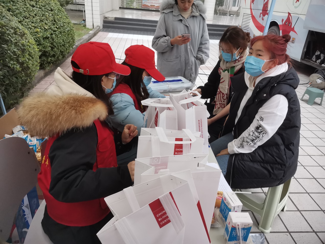 在献血过程中,志愿者为同学们宣讲献血的相关知识,并引导同学们有序的进行信息登记、验血型、抽血、领取无偿献血证。同时校青年志愿服务总队为来献血的同学们准备了红枣、糖果等小礼品,为他们送上温暖与关心。在这三天中,每个志愿者遵守职责,坚守岗位,分工协作,有序协助重庆市血液中心的医护人员开展献血工作。