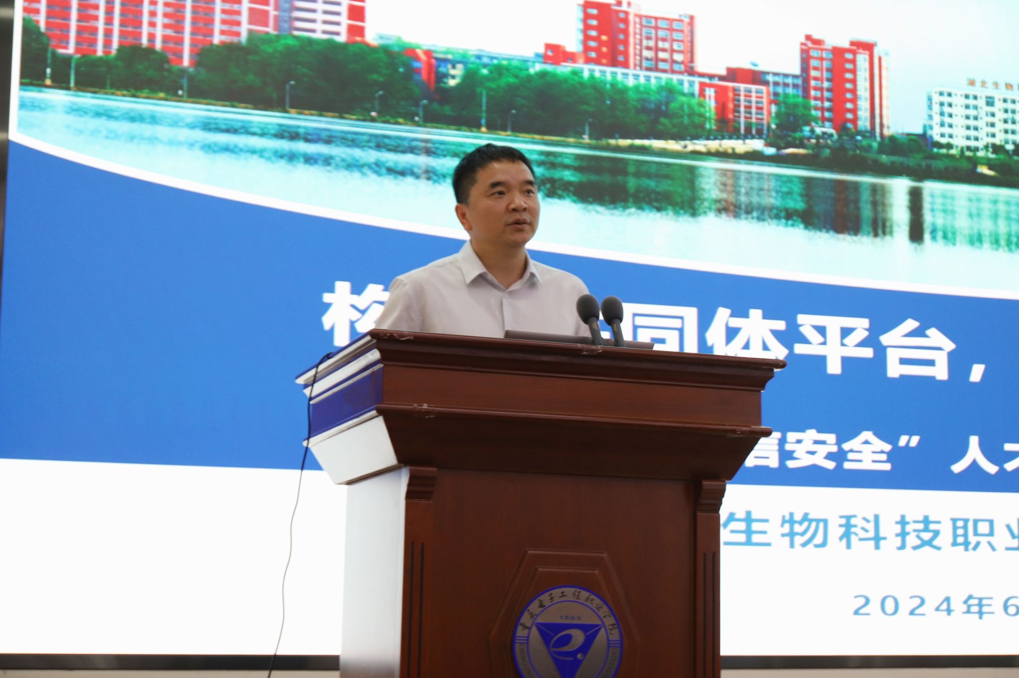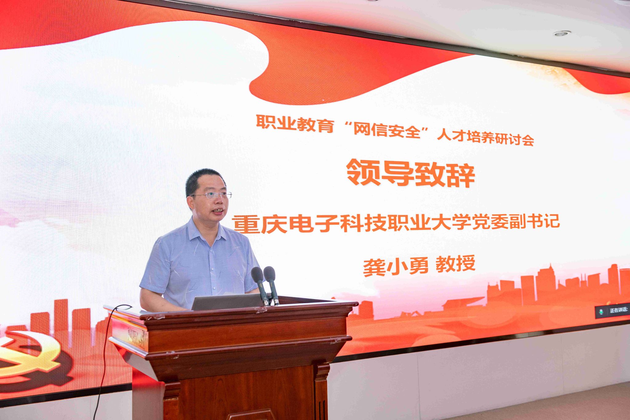 龚小勇副书记代表学校致辞。他提出,党的十八大以来,以习近平同志为核心的党中央高度重视网信人才培养工作,提出了一系列新思想、新观点、新论断,为新时代网信安全人才培养和建设提供了根本遵循。学校深入学习领会、全面贯彻落实,注重发挥“电子信息”办学特色优势,深耕网信安全人才培养,积极服务成渝地区双城经济圈建设,推进实施国家教育数字化战略行动,助力数字中国建设。近年来,学校以“可信计算”为特色,打造信息安全技术应用国家级高水平专业群,建立了多个技术研发与创新平台,并与多家机构和企业合作,取得了显著成绩。作为重庆市第一所公办本科层次职业学校,学校将继续深化合作,培养高质量的网信安全人才,推动数字经济产业发展,并全面推进本科层次职业学校建设,为现代职业教育体系构建和高质量发展贡献力量。