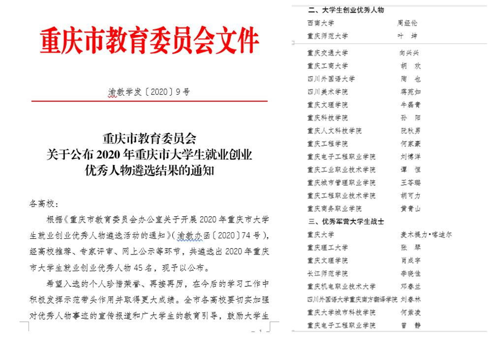 根据7月8日《重庆市教育委员会办公室关于开展2020年重庆市大学生就业创业优秀人物遴选活动的通知》(渝教办函〔2020〕74号),经高校推荐、专家评审、网上公示等环节,共遴选出2020年重庆市大学生就业创业优秀人物45名。pg国际2名同学当选,均来自电子与物联网学院。微电1502班的刘博洋同学当选“大学生创业优秀人物”、物工1904班的曾静同学当选“优秀军营大学生战士”。