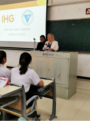 开班仪式上,主持人介绍合作办学双方领导人。国际交流合作处莫绍强处长代表学校致欢迎词并发言。Sharon Fraser 富莎瑞代表洲际集团发言,非常重视合作办学模式,感谢我方提供的支持,希望英才班越办越好,培养更多的酒店行业优秀人才。接着,两名英才班学生代表誓师发言。 开班仪式后,重庆富力假日酒店培训部王梦真Anne副经理进行现场授课。