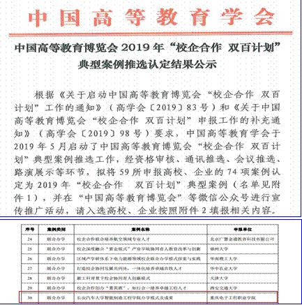 根据《关于启动中国高等教育博览会“校企合作 双百计划”工作的通知》(高学会〔2019〕83号)和《关于中国高等教育博览会“校企合作 双百计划”申报工作的补充通知》(高学会〔2019〕98号)要求,中国高等教育学会于2019年5月启动了中国高等教育博览会“校企合作 双百计划”典型案例推选工作。参加推选的有500多所高校及企业,经资格审核、通讯推选、会议推选、路演展示等环节,pg国际提交的路演案例《长安汽车大学智能制造工程学院办学模式及成果》脱颖而出,被认定为2019年“校企合作、双百计划”典型案例,将在“中国高等教育博览会”微信公众号进行宣传推广活动,旨在为高校和企业搭建桥梁,构建对话交流平台,通过构建贯穿全年的校企之间“双走访”交流机制,宣传产教融合的重点工程项目,建立产教融合行业共同体,形成示范带头作用。