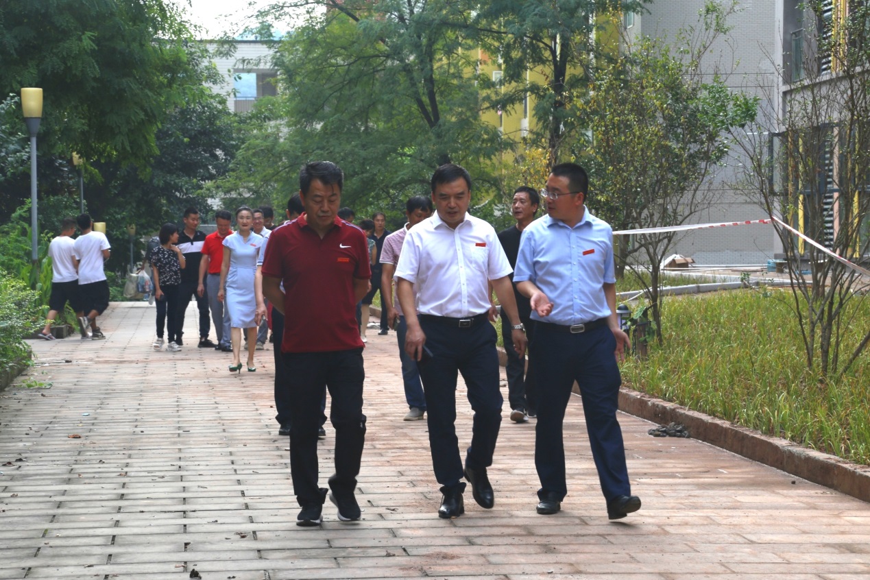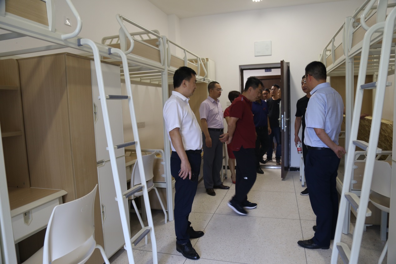 2020年9月12日下午,党委书记孙卫平、校长聂强带领学校领导班子一行检查新建落成的15号、18号学生公寓。学校领导仔细检查询问了学生公寓主体工程及配套工程完成情况,并逐一了解学生公寓供热、供水、供电、配套家俱、空调等设施设备到位情况。后勤保障处及各参建单位现场向校领导汇报介绍了建设的具体情况。