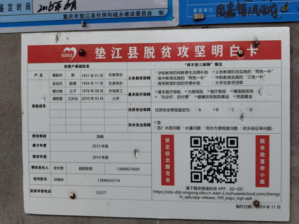 2013年底,谭老乡家成为了建档立卡贫困户,在当地政府和社区干部的帮助下,谭老乡家里房屋进行危房了改造。拆旧墙,砌新墙,浇水泥,筑钢筋,谭老乡家的房子从危房变成了安全等级为B的新房。不但如此,谭老乡的孙女义务教育也得到了解决,自己的病也有了医疗保障。