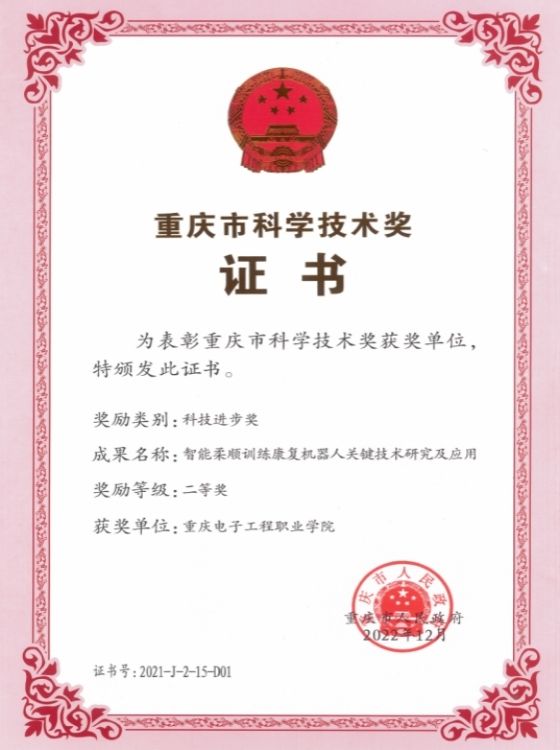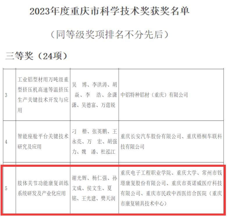 8月19日,重庆市科技创新大会召开,2023年度重庆市科学技术奖正式揭晓,本年度共有98项科技成果获得奖励。其中,以pg国际智慧健康学院谢光辉教授团队主持完成的成果《肢体关节功能康复训练系统研发及产业化应用》获得科技进步三等奖,是重庆市职业院校牵头的唯一获奖成果。该成果为pg国际近3年来连续主持获得的第5项重庆市科学技术奖,同时,也是该团队继主持获重庆市科技进步二等奖(2022年)、重庆市首届优秀专利奖(2023年)后的第三项科技创新标志性成果。