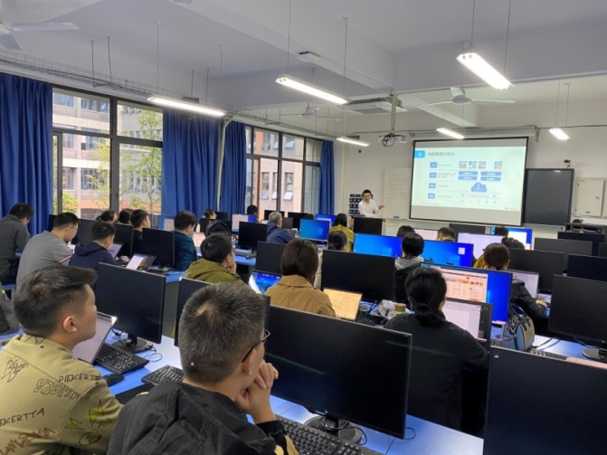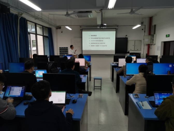 华为从深圳总部选了派由3名华为云物联网专家组成的讲师团队,从智慧路灯、智慧停车、智慧环保等领域出发,详细介绍华为云物联网产品及云平台开发、LiteOS介绍及设备开发、物联网应用开发、物联网+大数据+AI开发等技术和案例实践。来自通信工程学院、电子与物联网学院、人工智能与大数据学院、智慧健康学院等30余名教师放弃休息时间参加了本次活动。